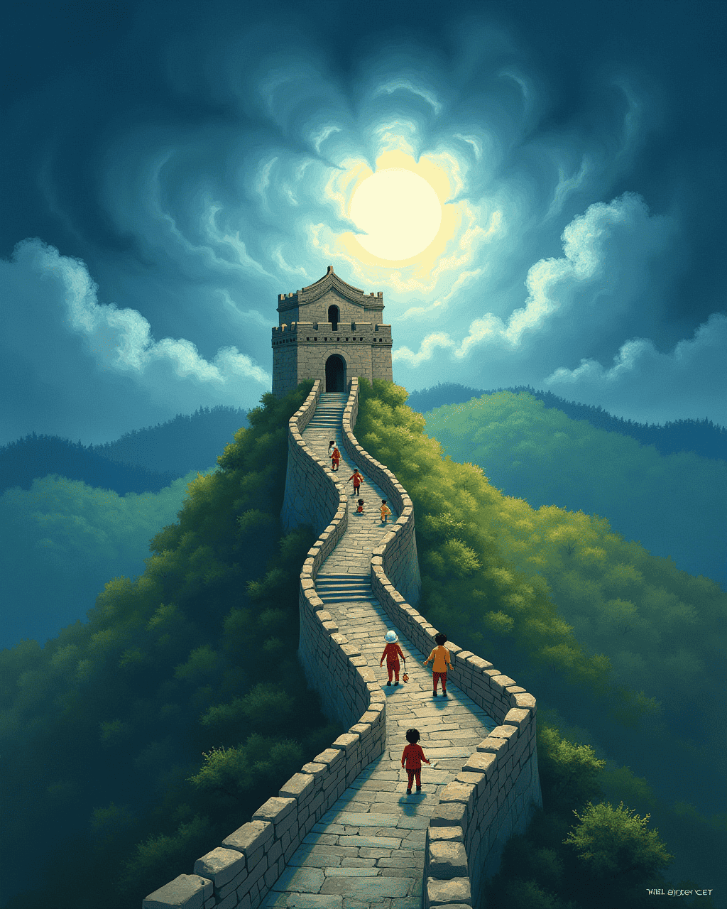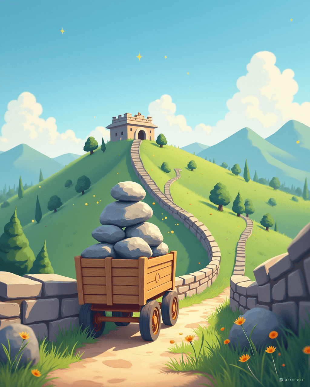 The journey was long and bumpy. I traveled in a wooden cart beside hundreds of other stones. We whispered to each other, wondering what kind of wall could need so many of us. When we reached the worksite, I saw mountains stretch like dragons across the horizon. The builders stacked stones carefully, one by one, forming a wall that climbed the hills like a sleeping giant.