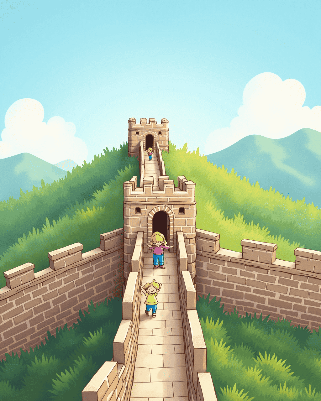 They placed me between two large stones, high above the ground. I felt the weight of history press upon me. For years, I stood under the blazing sun, freezing winds, and falling snow. Travelers walked upon me, soldiers guarded from my height, and children laughed as they ran along the wall. I realized that “Great” wasn’t about size — it was about lasting forever.