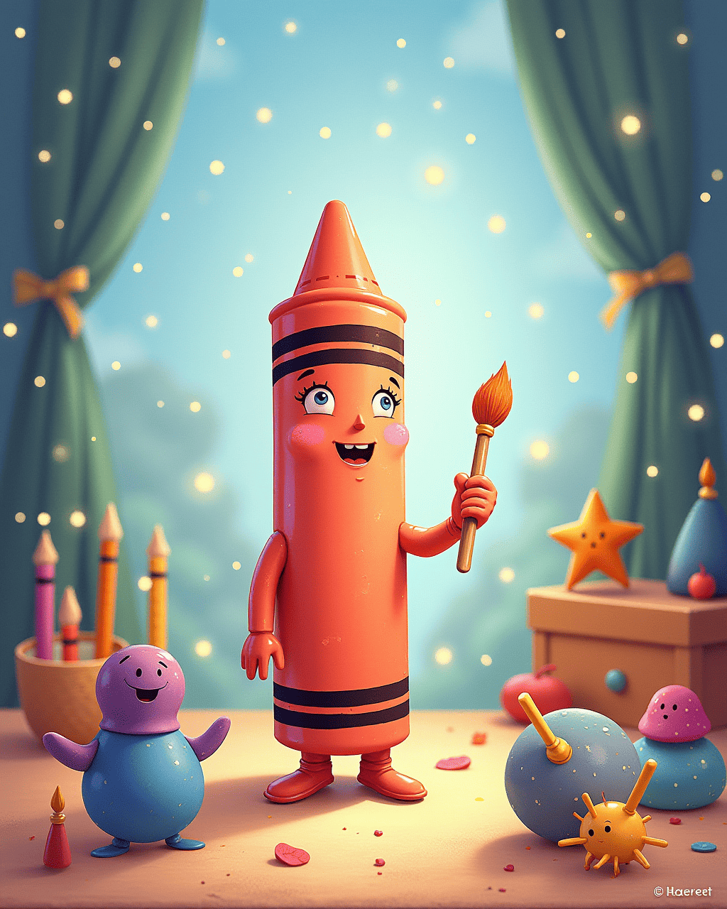 Days passed, and Coral’s clay sculptures began to fill the table—a star, a tiny bird, even a crayon holding a brush. The other crayons started to admire his creations. One day, a child saw the collection and placed them all on a shelf, calling it 'The Gallery of Dreams.' Coral finally smiled, realizing he didn’t have to color to create beauty—he just had to be brave enough to shape his dream.