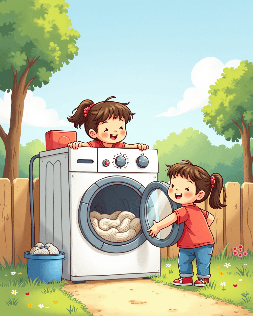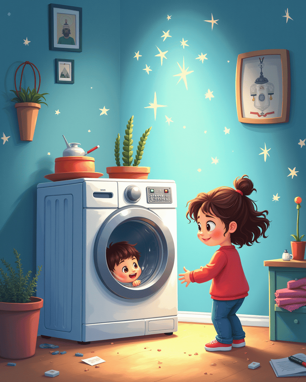 After the adventure, the washing machine gently landed back in their garage. The door opened, and the smell of soap and laughter filled the air. Their clothes were perfectly clean, but more importantly, so were their hearts. Mia smiled, ‘Next time, let’s try the dishwasher!’ And Leo laughed, already imagining their next big invention.
