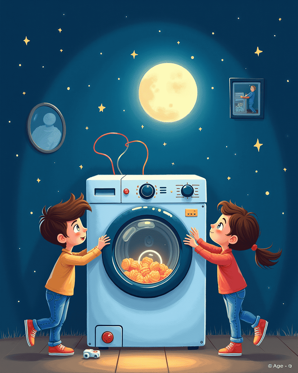 After connecting some colorful wires and pressing every button they could find, the washing machine began to hum. Lights blinked, and suddenly, the drum started to spin faster and faster. Mia held Leo’s hand tightly as the room blurred around them. With a whoosh, the washing machine lifted off the ground. They had turned laundry day into a space adventure!