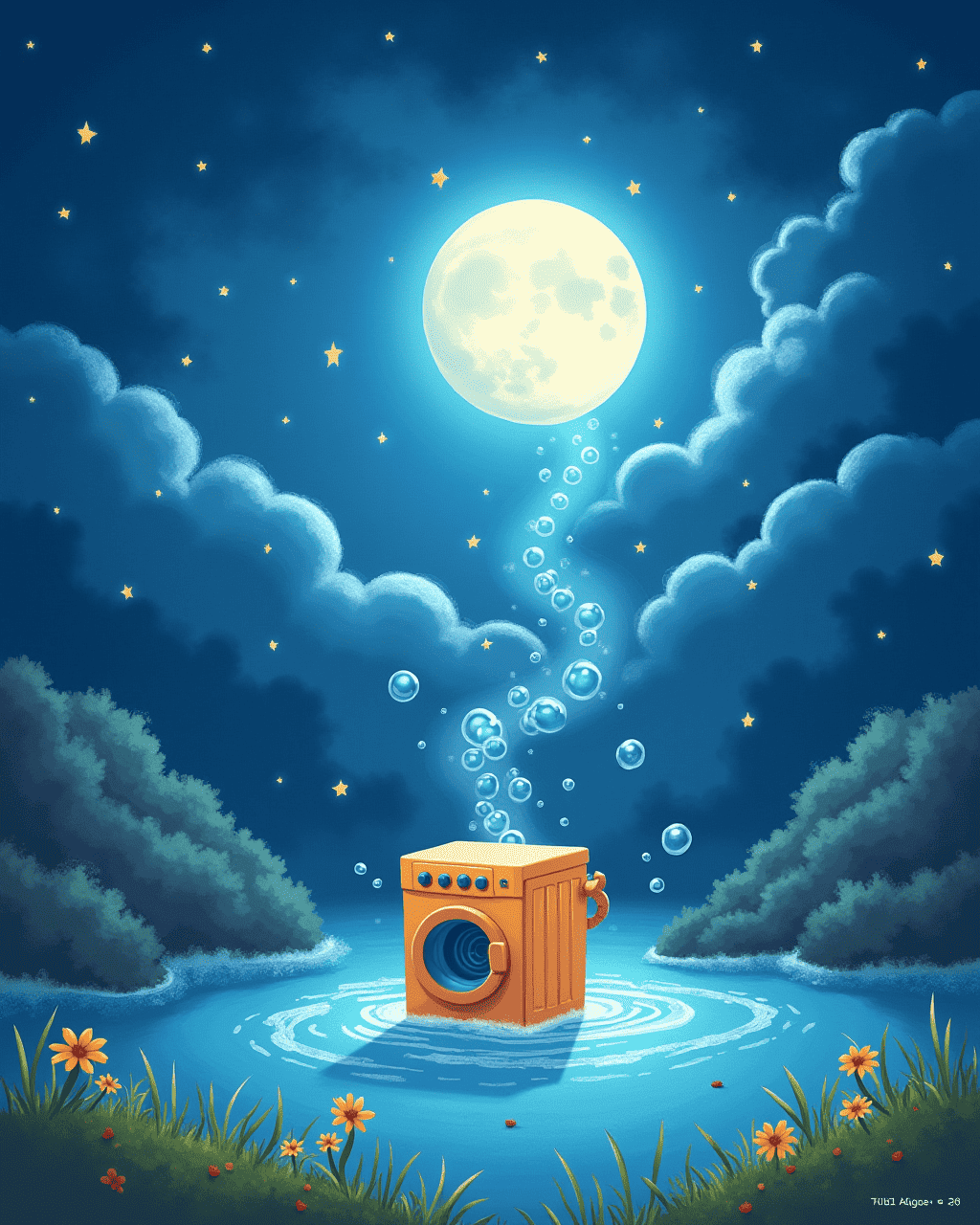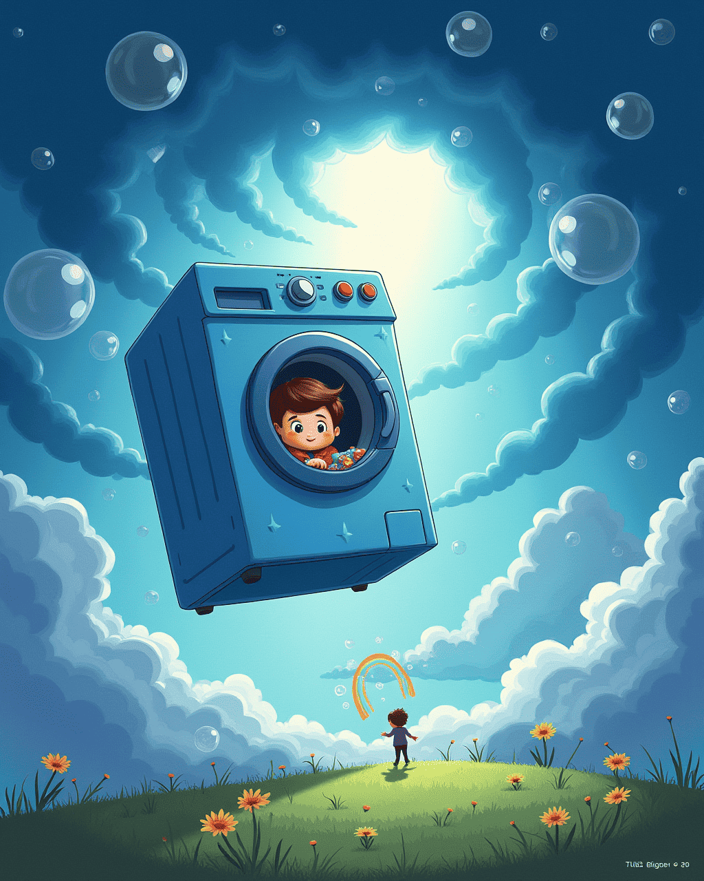 The washing machine landed softly on a planet made entirely of soap bubbles. Each bubble reflected a rainbow and floated gently in the air. The friends met Bubble Beasts—kind, giggling creatures that helped them bounce from one bubble to another. Mia realized that laughter was the key to steering their washing machine. The more they laughed, the higher they floated!