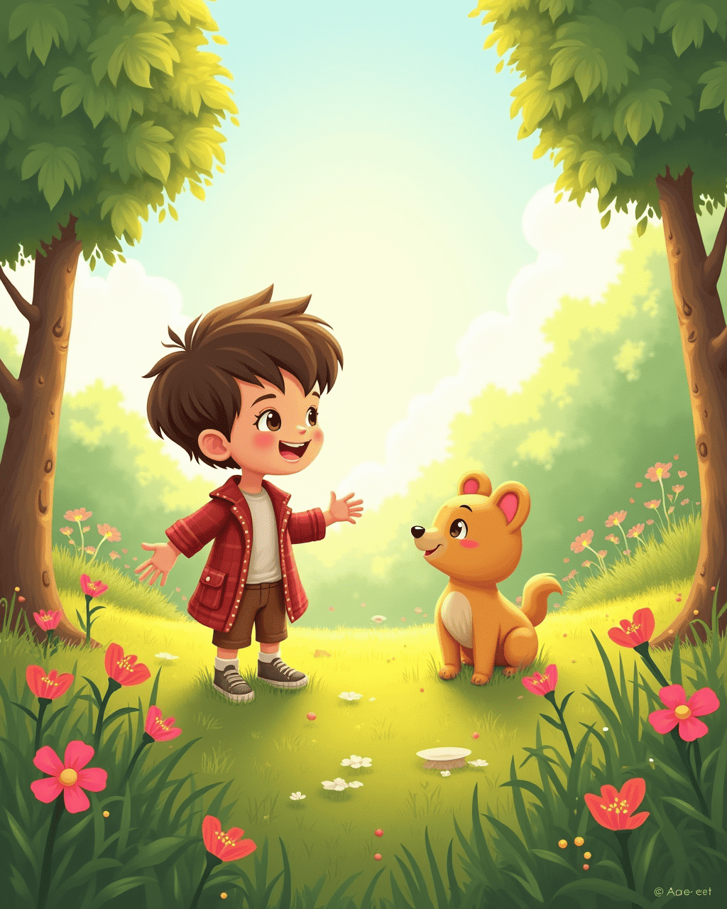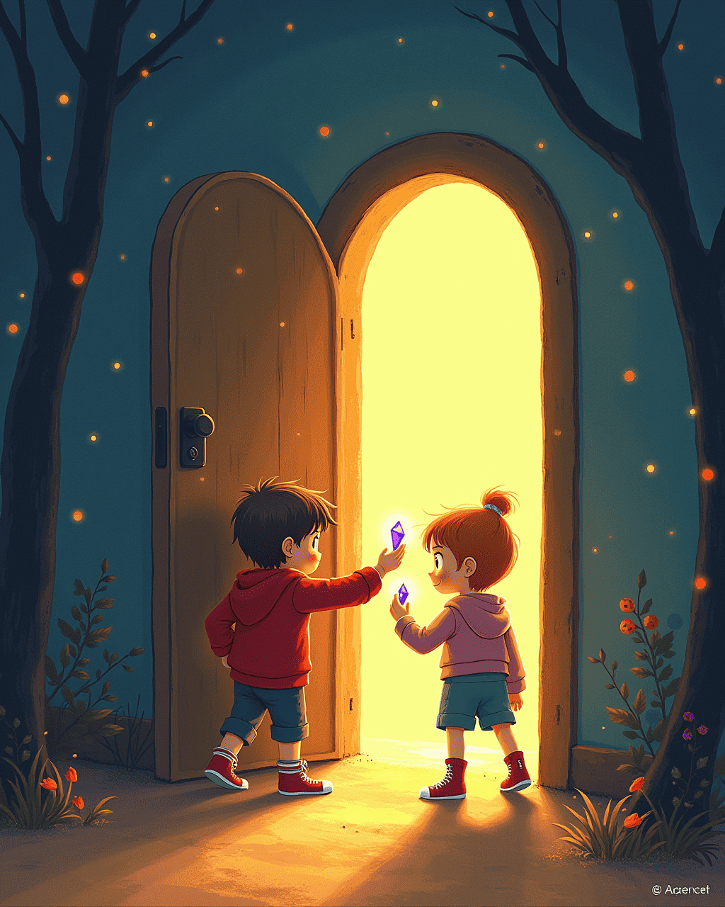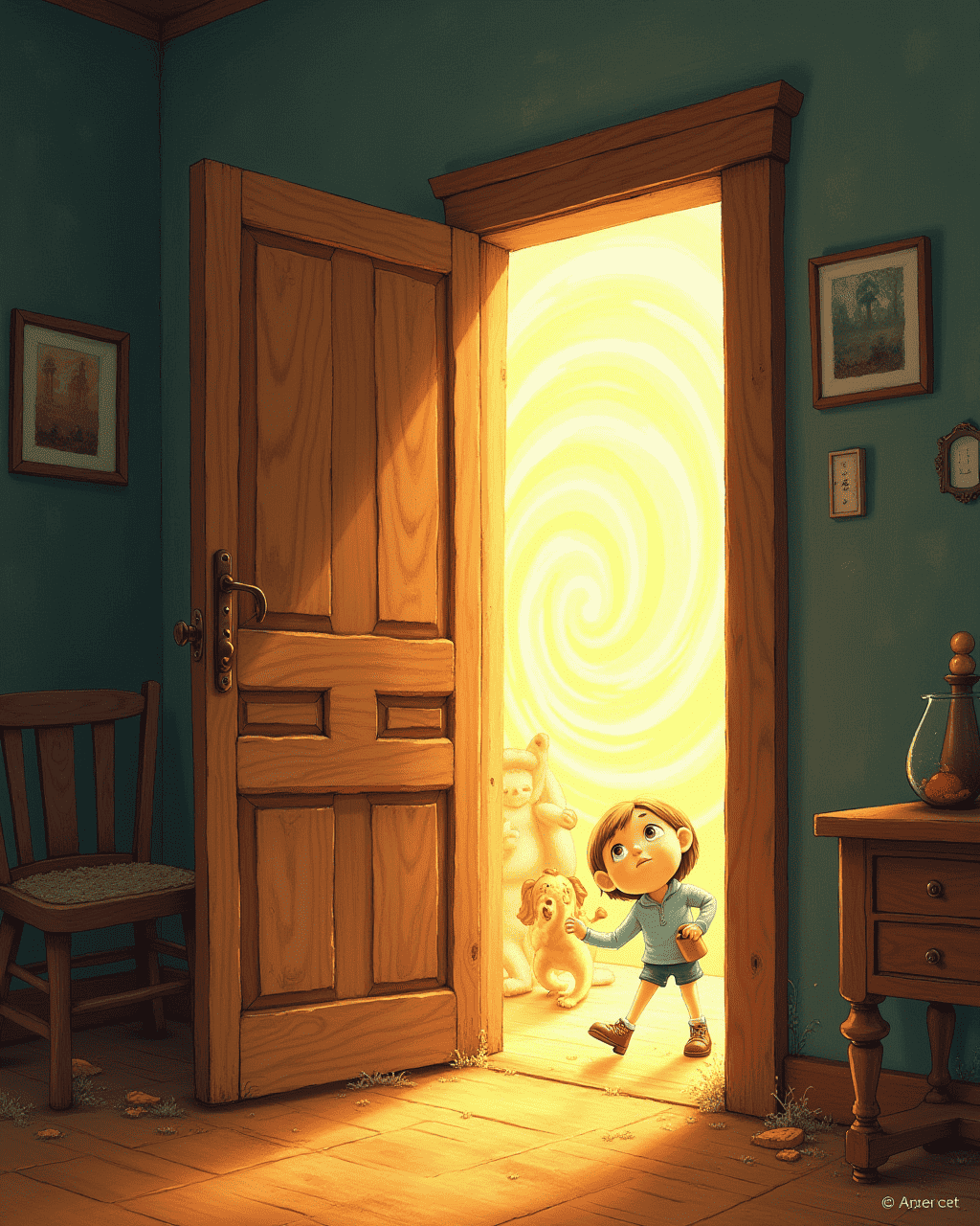 Tom and Lily were exploring their grandmother’s attic when they found an old wooden door standing alone. It wasn’t attached to any wall, yet it shimmered faintly in the sunlight. Curious, Tom reached out to touch the knob, and it felt warm, almost alive. Lily giggled and pushed the door open, revealing a swirling tunnel of light. Without thinking, they stepped through together.