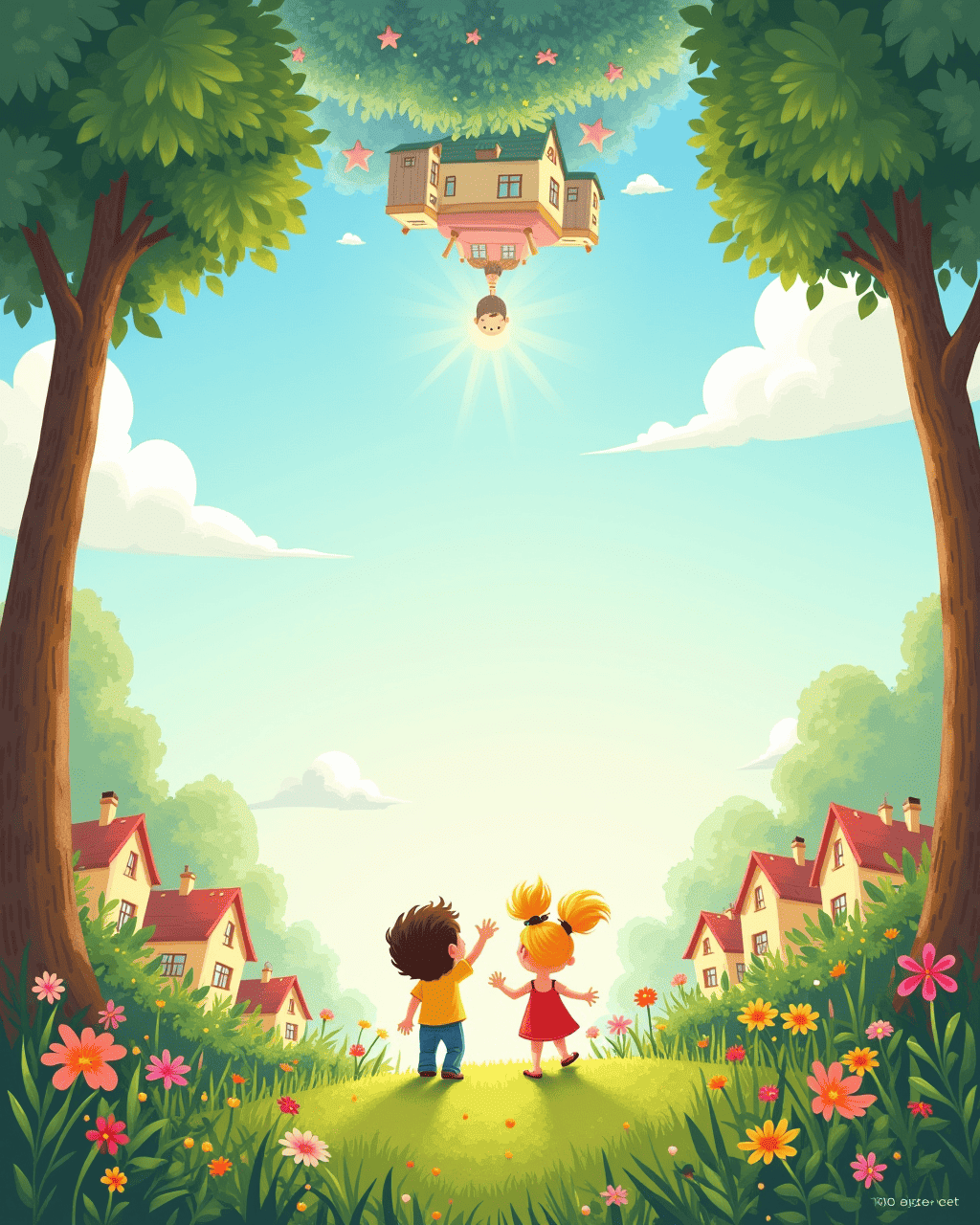 When they opened their eyes, they found themselves floating upside down! Houses stood on clouds, and trees hung from the sky. People were walking on the ceiling of the world, waving cheerfully. Tom tried to stand but drifted higher instead, laughing in surprise. Lily twirled around, her hair floating like a ribbon.
