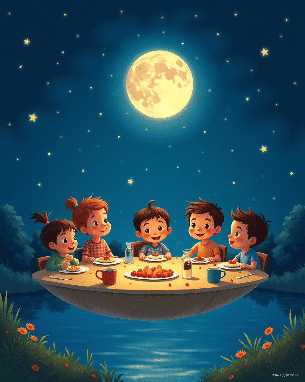 That evening, Milo invited them to a feast held on the underside of a floating island. Plates and cups were stuck to the table by invisible magnets. They ate glowing fruit and rainbow soup that sparkled like stars. Lily laughed so hard that her soup floated away. Tom tried to catch it, and everyone clapped when he finally did.