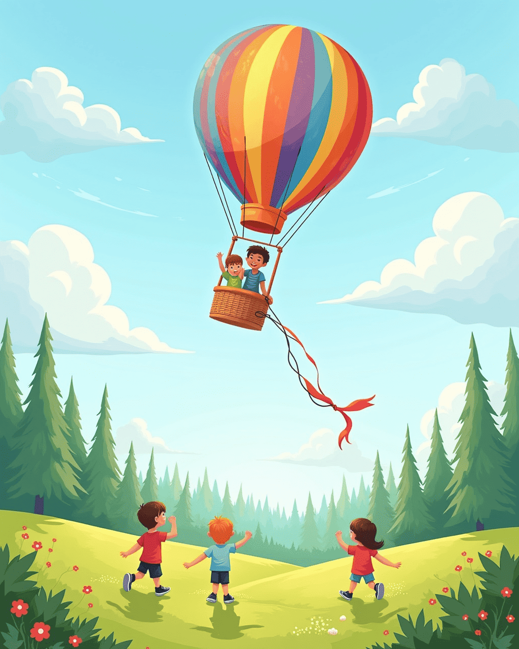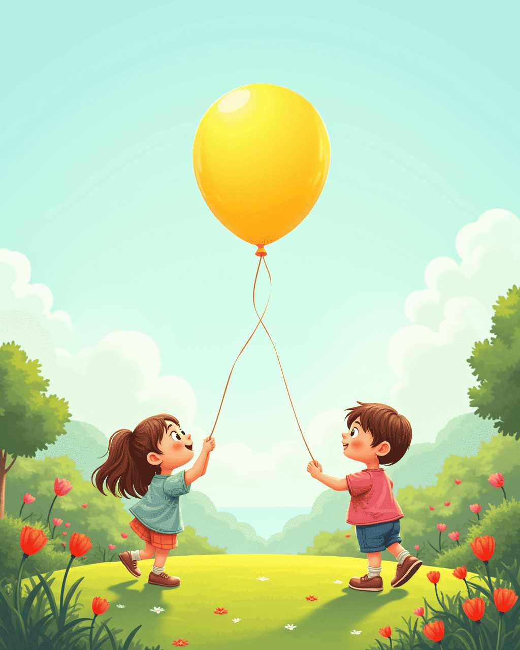 On a bright sunny morning, a little yellow balloon named Zippy floated into the park, looking a little lonely. Three curious children—Mia, Leo, and Sophie—noticed Zippy drifting near the flower beds. They whispered to each other and decided to ask Zippy if it needed a friend. To their surprise, Zippy answered with a bright smile, saying it was looking for an adventure. "Come on! Let’s see where we can go together," Zippy giggled, and the children hurried toward the open field.