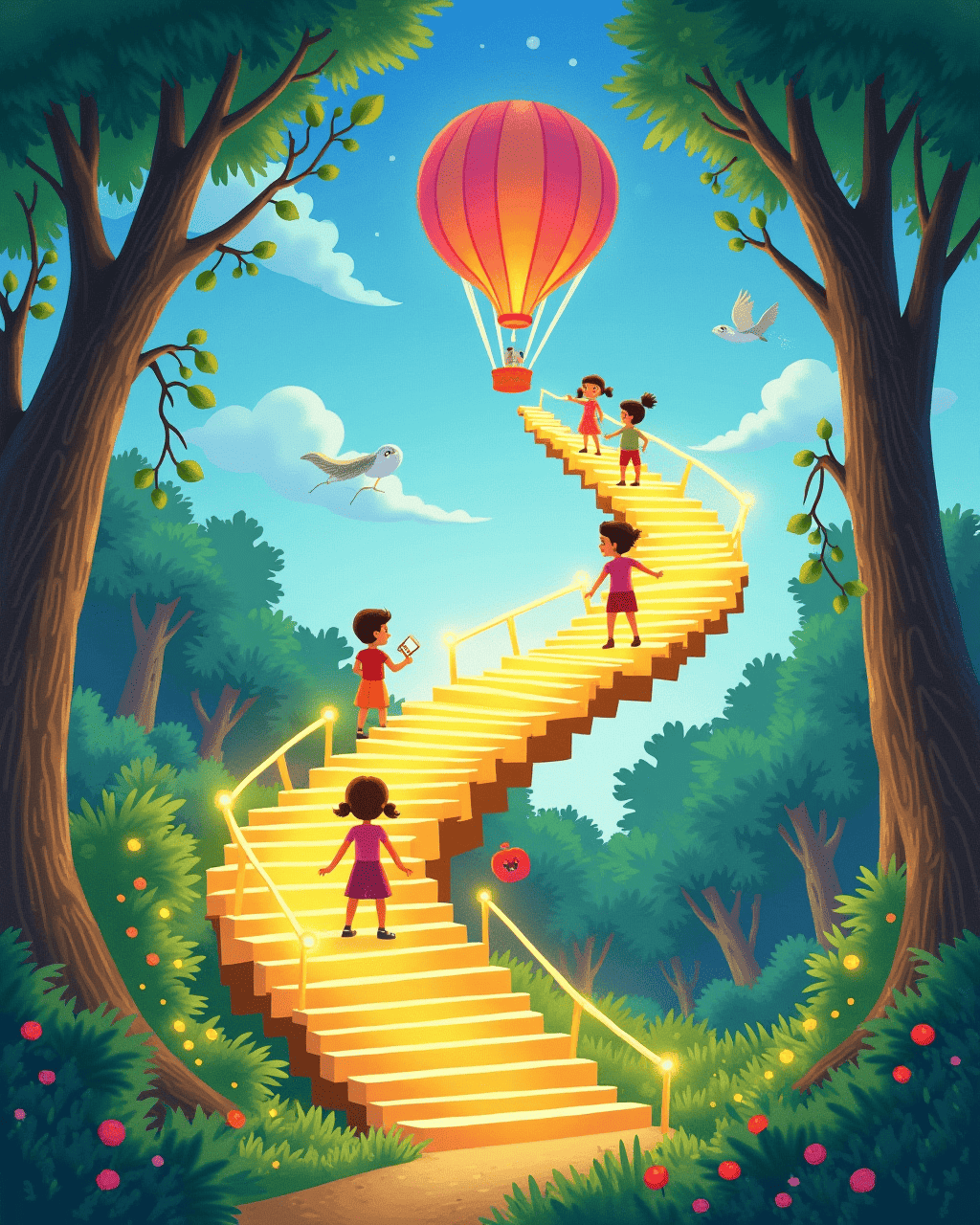 Orion taught the children how to listen to the wind’s rhythm, and when they joined in, the wind lifted them higher. Suddenly, a swirl of leaves turned into a giant, spiraling staircase that led above the forest canopy. The staircase glowed with golden lights, and the children felt their excitement grow as Zippy followed them upward. Once they reached the top, the sky turned into a canvas of stars, and the children saw a path made of moonbeams. They stepped onto the path, and it swept them into a world where clouds were made of cotton and the sky was rainbow-colored.