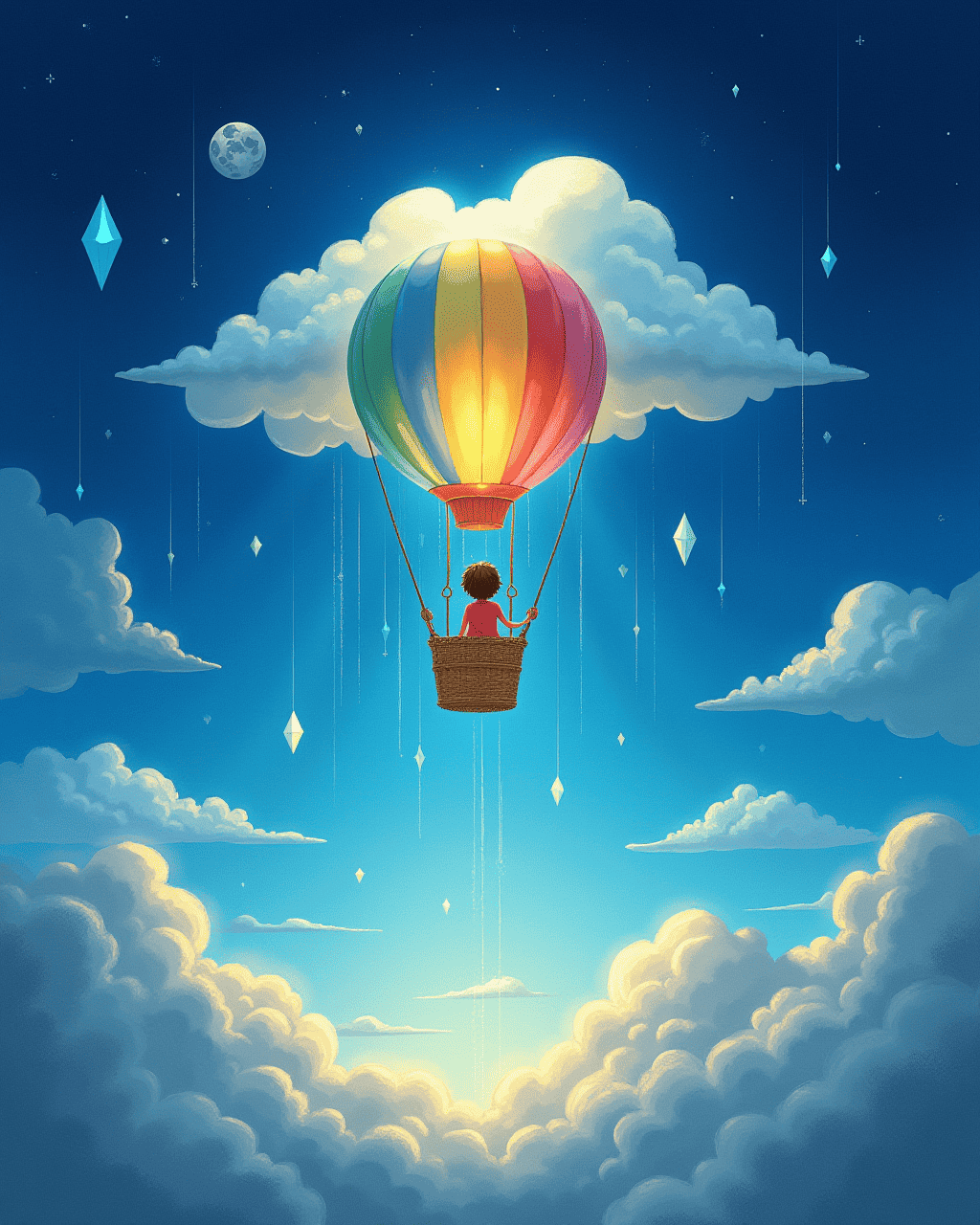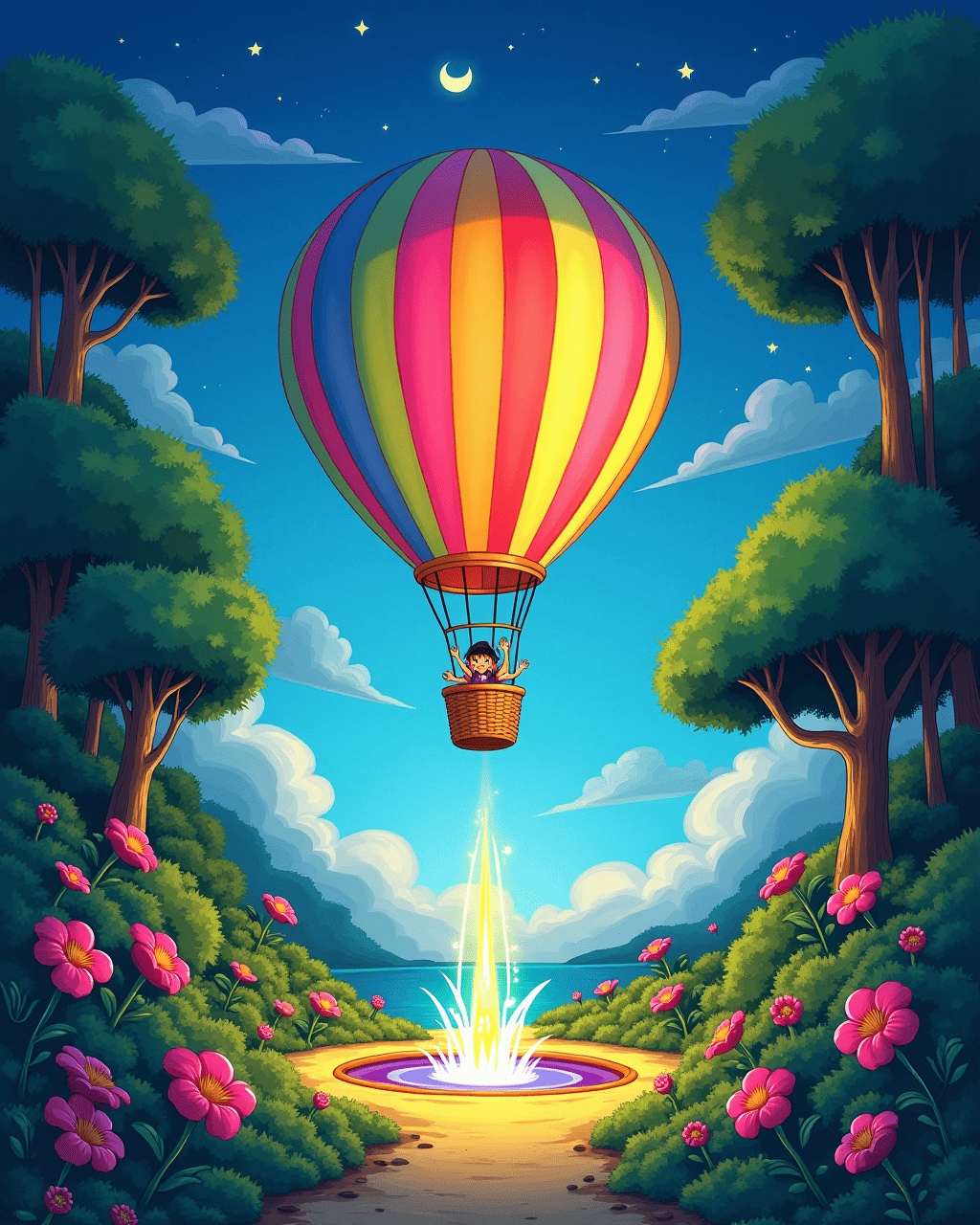 When the moonlight faded, Zippy spun into a bright, swirling portal that opened onto a hidden island. The island was lush with glowing vines and singing flowers, and a crystal fountain sparked rainbow colors into the air. The children found a treasure chest, but instead of gold, it was filled with stories and songs from every world they've visited. Each song carried the melody of the sky, the forest, and the clouds, and the children danced in pure joy. After their dance, the island's vines wrapped Zippy gently, reminding the balloon that kindness brings every world together.
