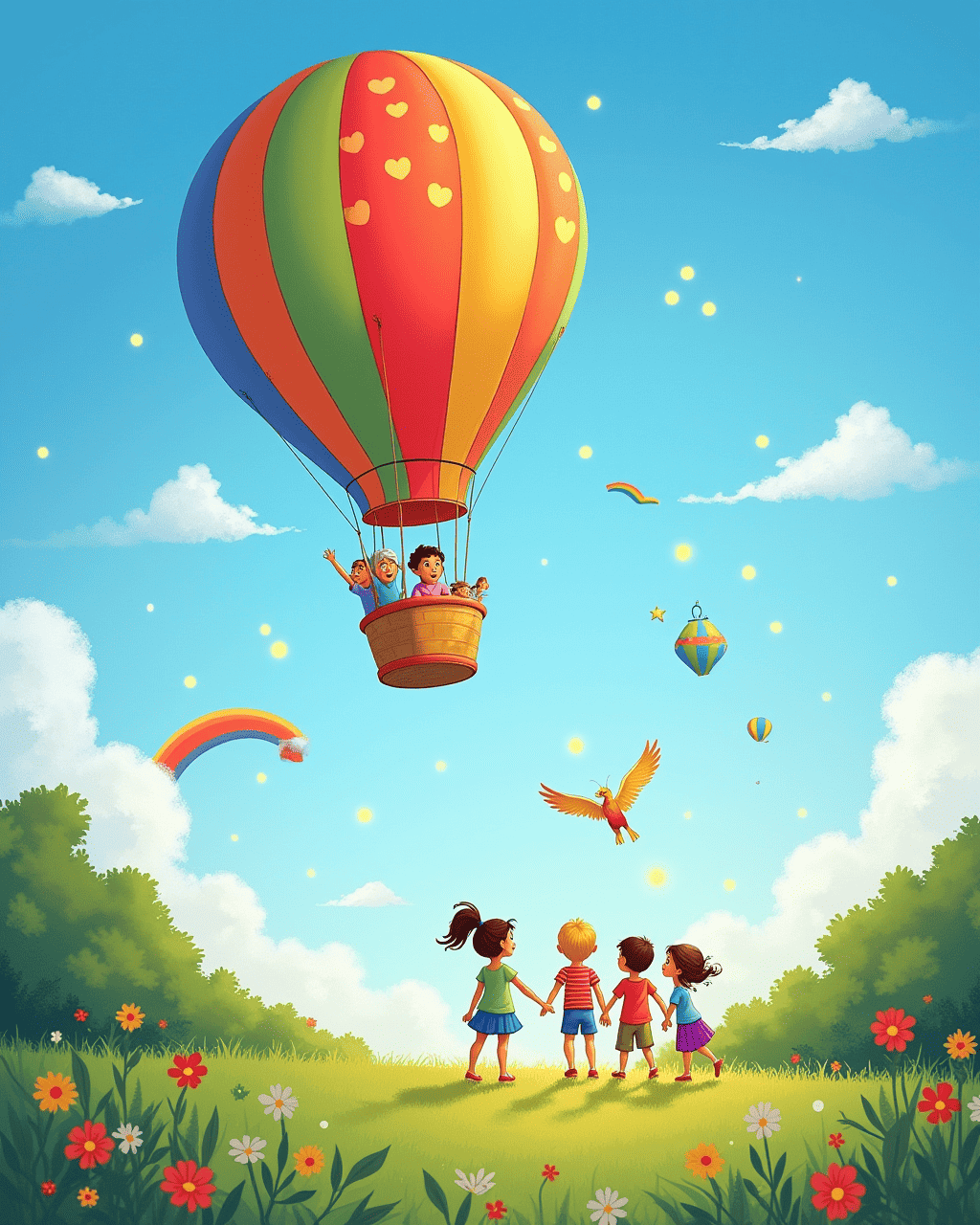 With their hearts full, the children and Zippy began the journey back, guided by Orion's cheerful call. They passed through the forest, the cloud kingdom, and the island, each world waving farewell with warm, glowing lights. As they returned to the park, the sky began to settle, and Zippy lowered the children back to the ground. They said goodbye to their new friends, realizing that adventures can be shared anywhere and anytime. With a final puff of sunshine, Zippy drifted back into the sunshine, happy to have brought its new friends home.