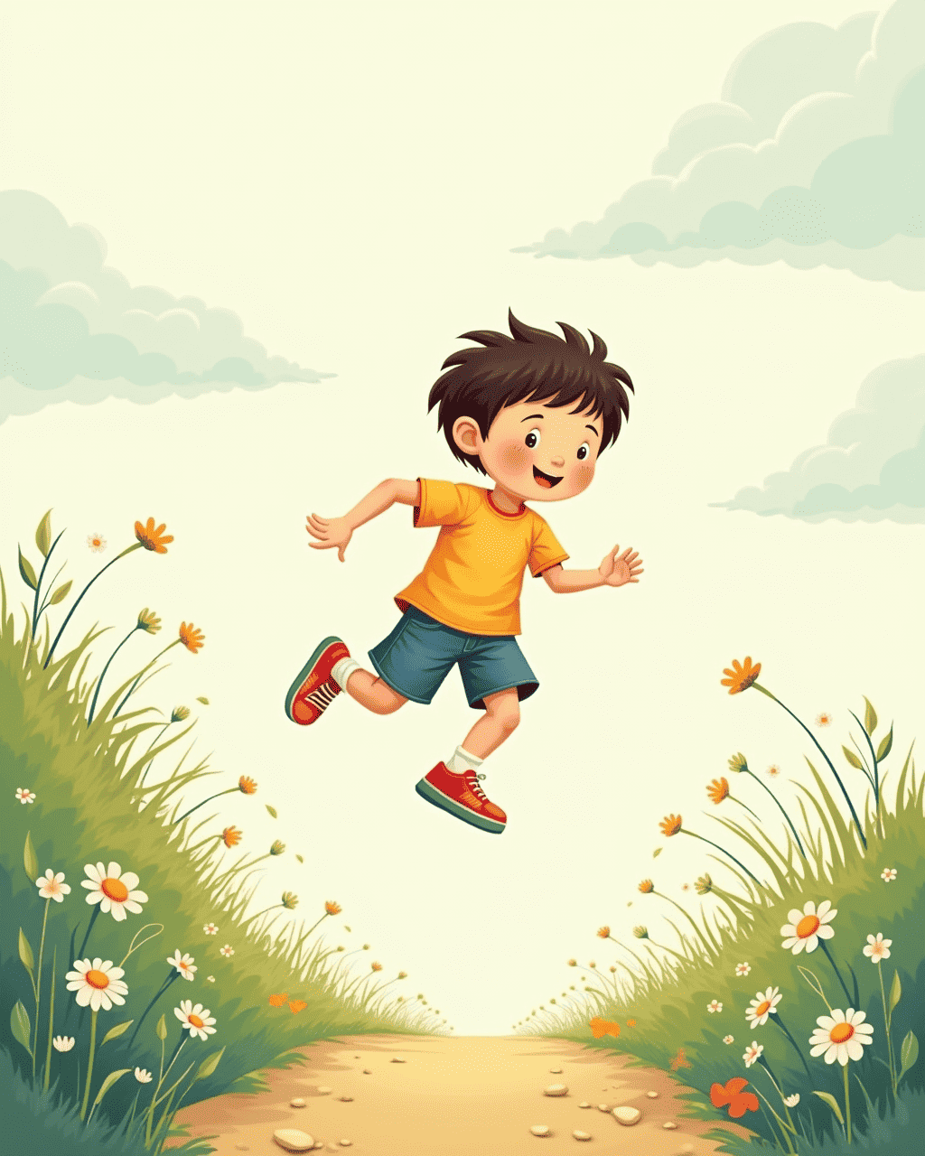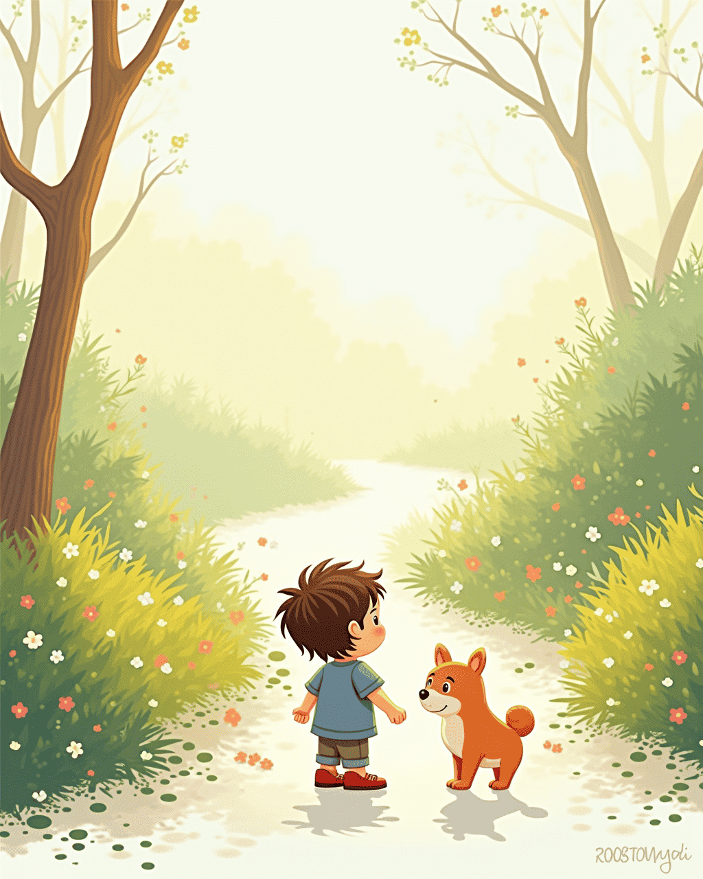 Milo found himself inside a sunny field where the color of the grass was brighter than any picture he had ever seen. There were wildflowers that smelled like honey and a gentle breeze that sang a tune. He noticed a child playing with a kite and felt a tug of unfamiliar companionship. As he approached the child, the child turned and smiled, laughing happily. Milo realized that this place was not just a picture— it was real and full of living things.