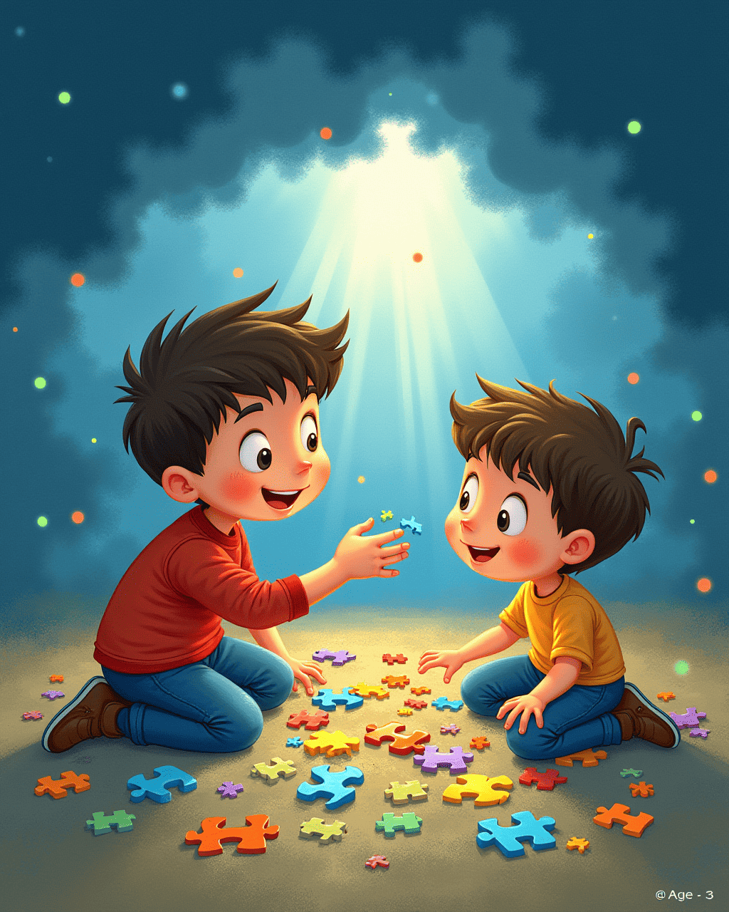 Sam asked for help with a jigsaw puzzle. The pieces were scattered and many were missing. Tommy sorted them by shape and color. He showed Sam how to match corner pieces first. The puzzle soon formed a bright picture of a rainbow.