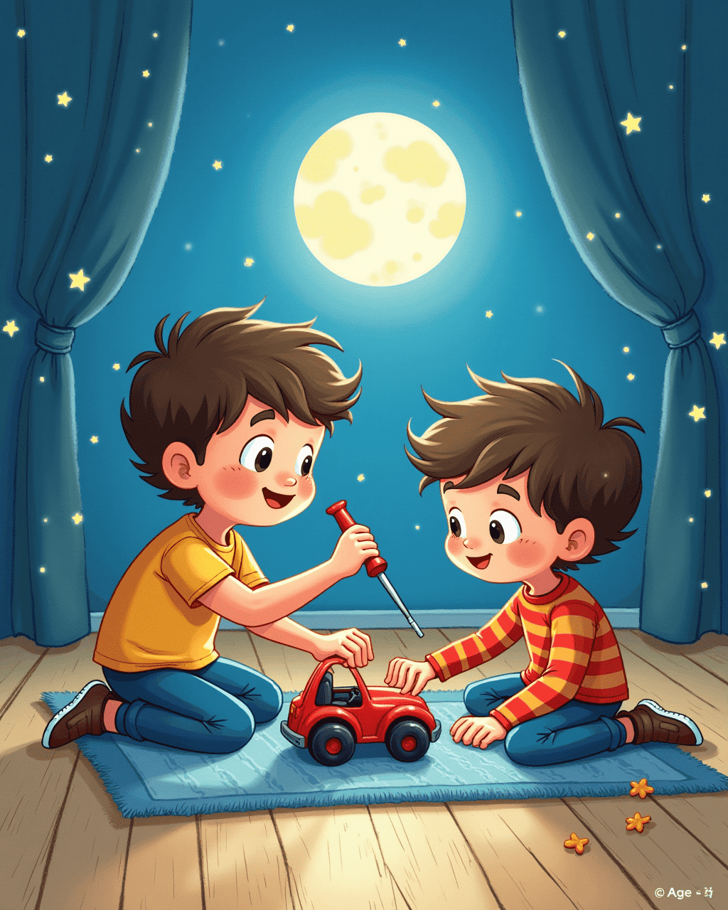 Ben had a toy car that wouldn't start. Tommy inspected the motor and found a loose wire. With a small screwdriver, he tightened the connection. The car zoomed across the floor like a racing champion. Ben high‑fived Tommy and thanked him.