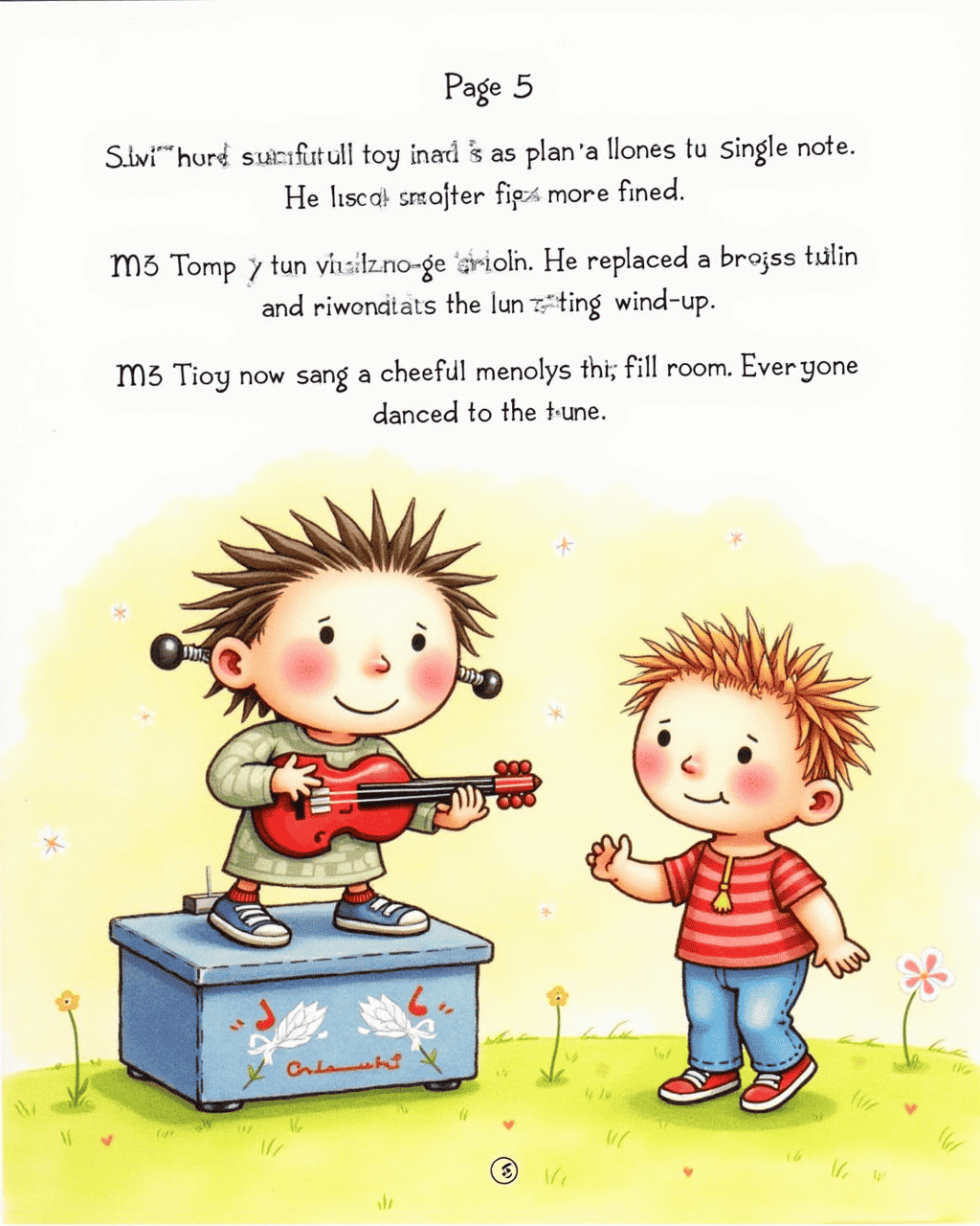 Cindy had a musical toy that played only a single note. Tommy tuned the tiny violin inside. He replaced a broken string and rewound the tiny wind‑up. The toy now sang a cheerful melody that filled the room. Everyone danced to the tune.