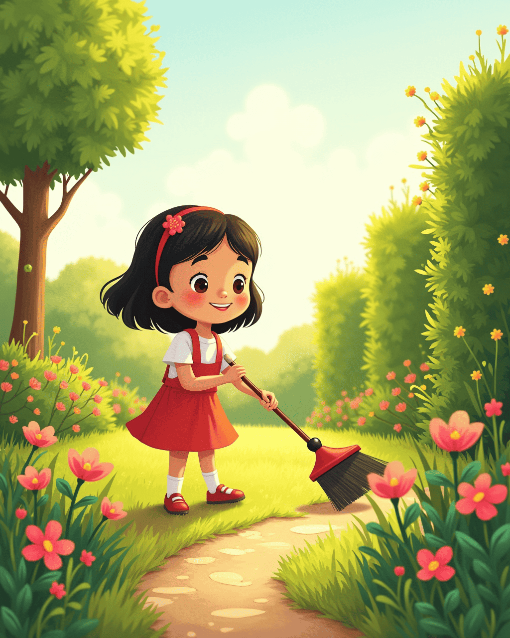 They worked through the morning. Mia swept the path, while Mr. Lee trimmed the hedges. They sang a little song about sunshine. The garden turned green again, and the air smelled fresh. Mia felt proud of the clean, tidy place.