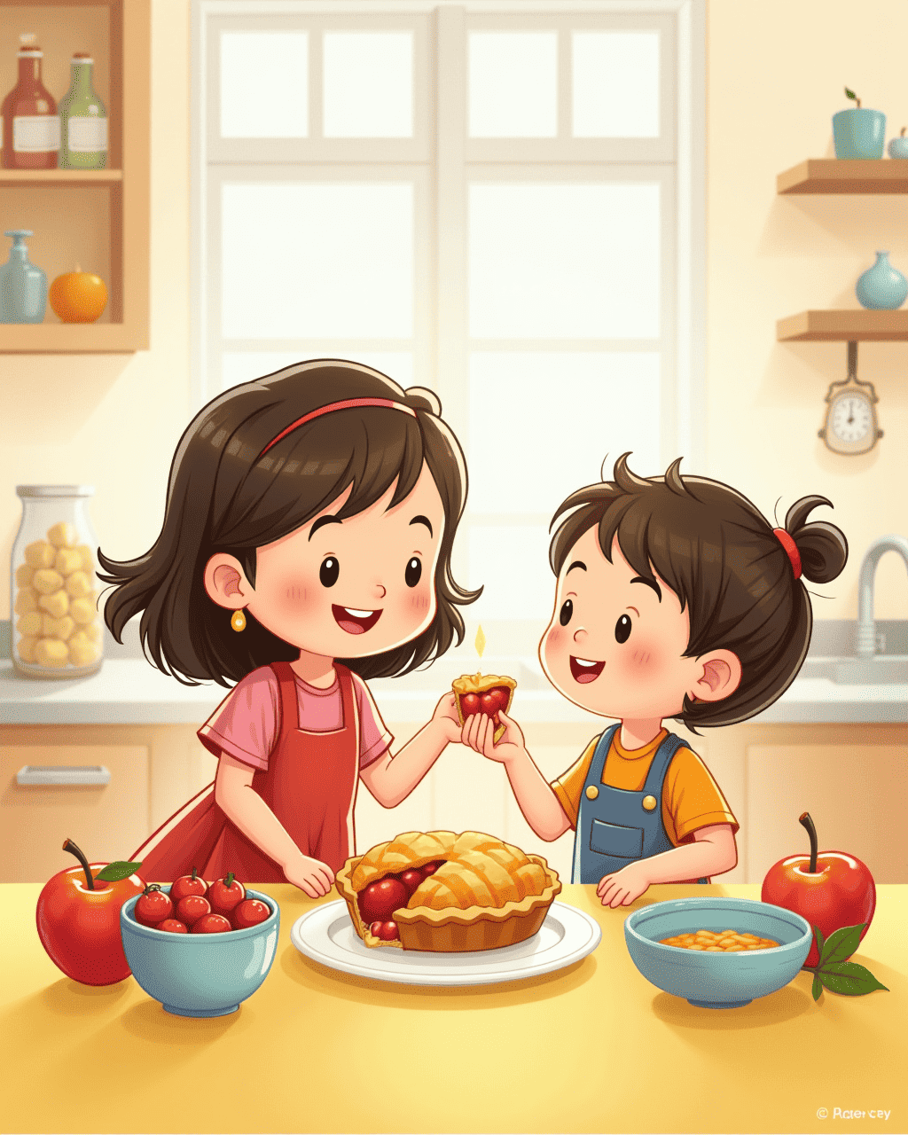 After the work, Mr. Lee led Mia to the kitchen. He had baked a fresh apple pie. The pie smelled warm. Mia tasted a bite and giggled. "This is the best pie ever," she said, sharing with Mr. Lee. Both smiled at each other, enjoying the sweet treat.