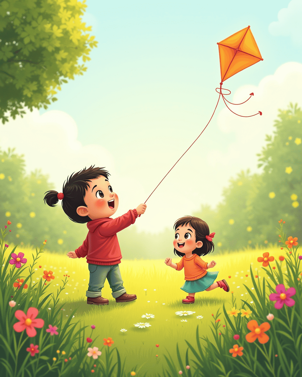 They spent the afternoon playing with a tiny kite. The kite flew high. Mr. Lee taught Mia how to steer it. Mia laughed, and the kite made a bright swirl. Their friendship blossomed like a flower.