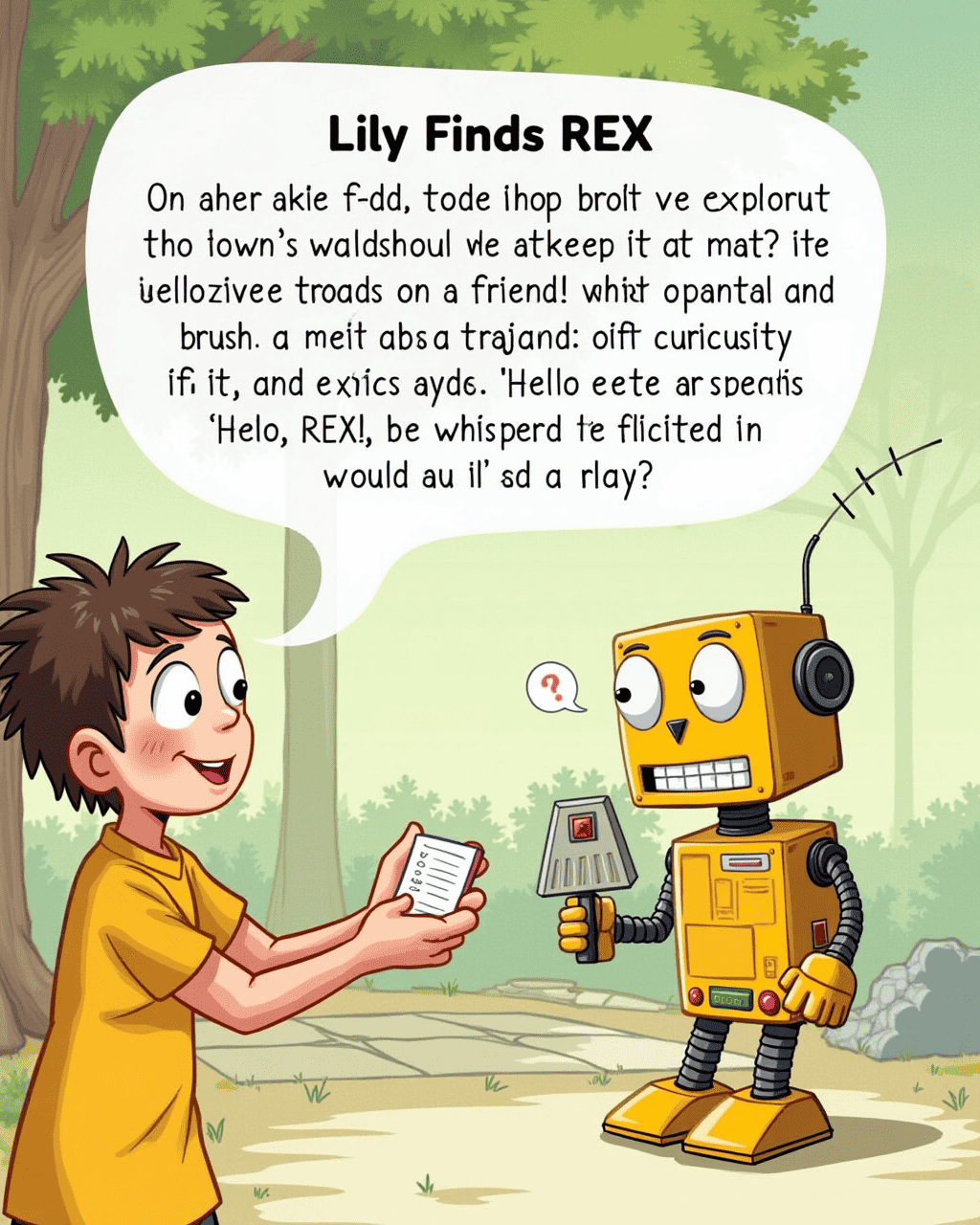 On a bright Saturday morning, Lily was exploring the town’s old workshop. She spotted a dusty, yellow robot on a shelf and wondered if it needed a friend. She brushed the metal arms and discovered REX, a robot that blinked its eyes with curiosity. Lily smiled and whispered, 'Hello, REX! Would you like to play?'. The robot’s lights flickered in excitement, signaling its eagerness to start an adventure.