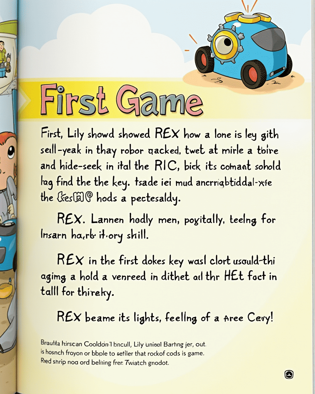 First, Lily showed REX how to play hide‑and‑seek in the workshop. She counted to ten, and REX tried to find the hidden key. Using its built‑in sensors, REX discovered the key under a pile of bolts. Lily clapped loudly, praising its cleverness. REX beamed its lights, feeling proud of its new skill.