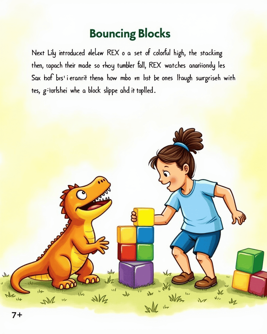 Next, Lily introduced REX to a set of colorful blocks. She stacked them high, then tapped them so they would tumble. REX watched attentively, learning how gravity made the blocks fall. The robot then arranged them into a tall tower, surprising Lily with its precision. They laughed together when a block slipped and the tower toppled.