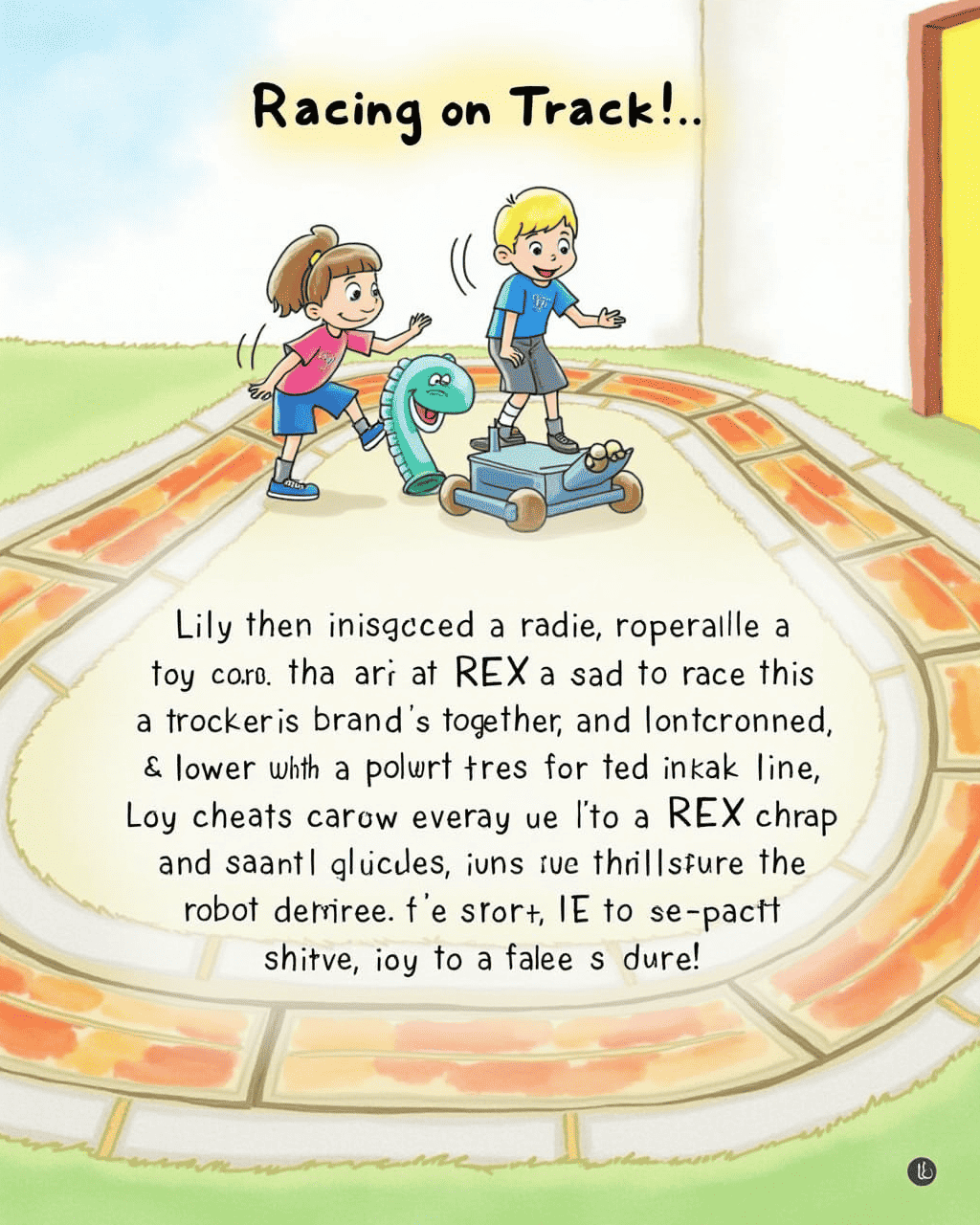 Lily then suggested a race with toy cars. She set up a track on the floor. REX programmed a small wheel, and together they powered the robot to the finish line. Lily cheered every time REX crossed the line, and she helped the robot repair a small glitch. REX felt the thrill of speed and friendship.