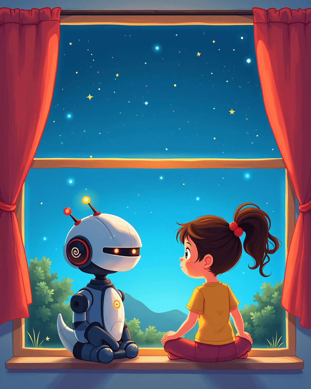 After the day, Lily and REX sat by the window, looking at stars. They talked about future games and adventures. REX promised to protect Lily from any sparks. Lily promised to take care of the robot and share its stories. Together, they dreamed of many more playgrounds filled with imagination.