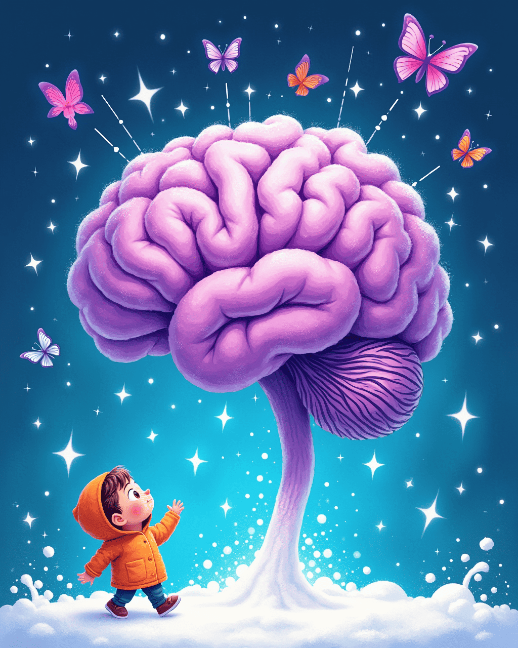 Pip finally reaches the brain. The brain looks like a purple snowflake. It sends signals to all parts of the body. Pip hears thoughts flutter like butterflies. It shows how ideas travel.