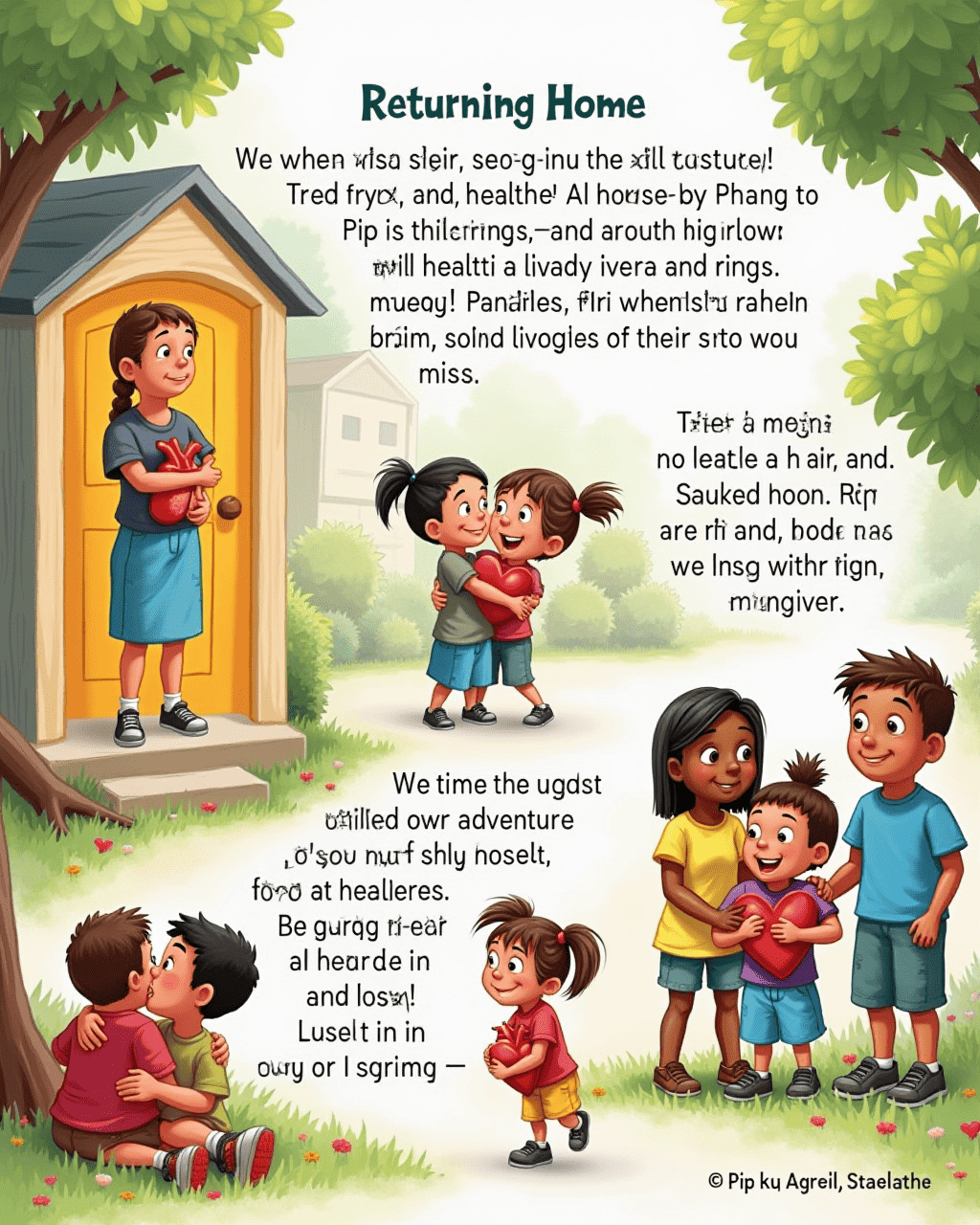 When Pip returns, the body feels healthier. Pip knows more about the heart, brain, lungs, and muscles. Pip shares the adventure with friends back on the outside. The story ends with Pip hugging the heart again, grateful.