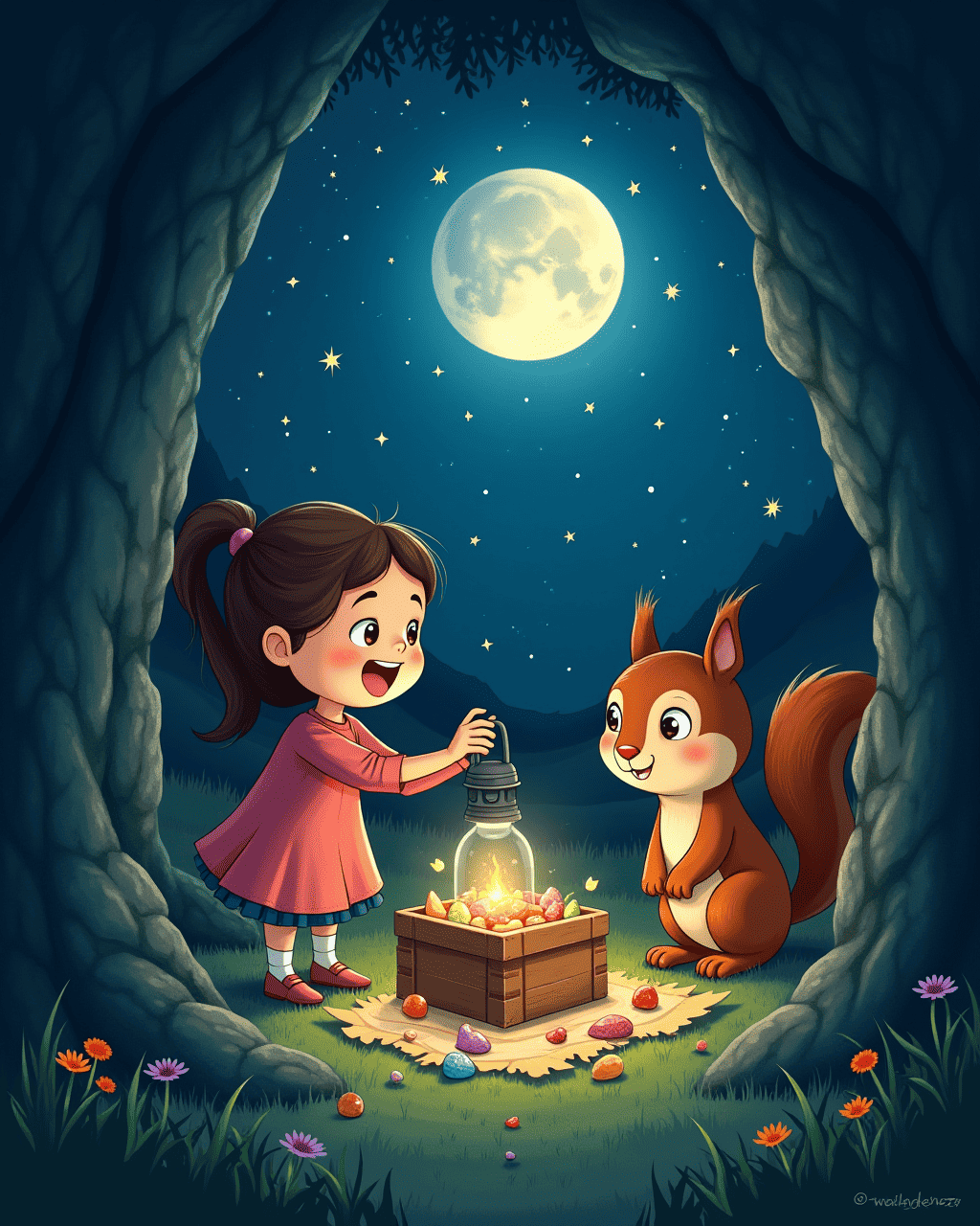 4. Inside the cave, they found a small wooden box filled with colorful stones.
