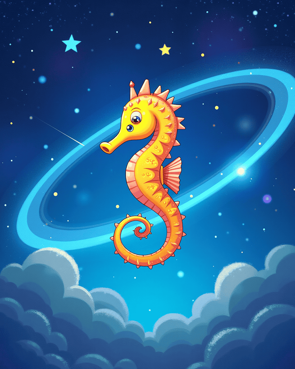 The stellar seahorse floated in the blue space sea of Saturn's rings. Its body shimmered in all the colors of a rainbow comet. It sang soft lullabies in the silence of space, calming wandering astronauts. One day it helped a lost shuttle navigate by shimmering with a tiny glowing heart. Children adored watching it swim between shining rings.