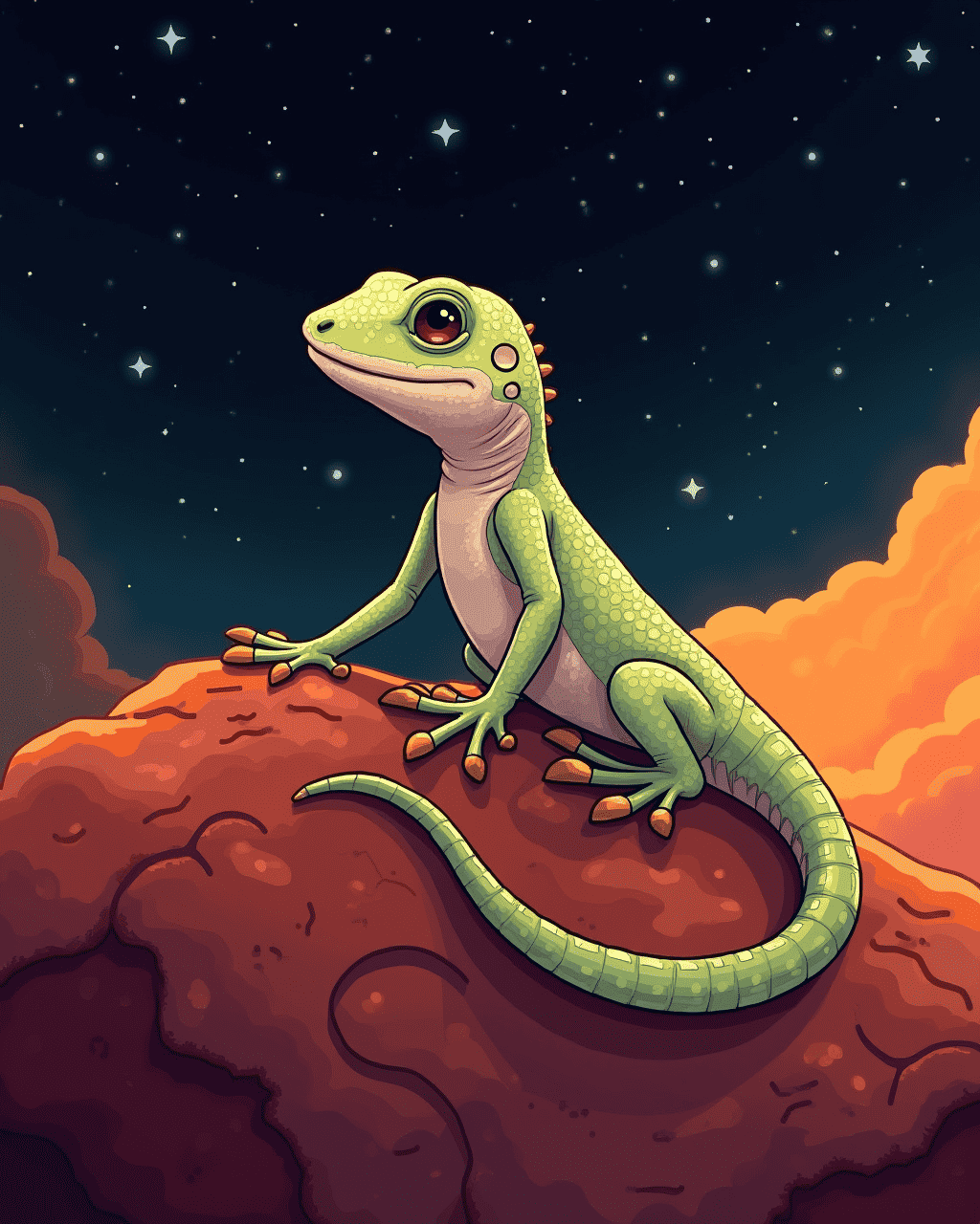 The galactic gecko perched on a moon of Mars, where the horizon burned orange. Its skin was covered with shining silver plates. It could jump across the craters like clouds of gas. Children giggled when it stretched wide, making a crescent shape with its tails. The gecko sang a song that echoed in deep black space.