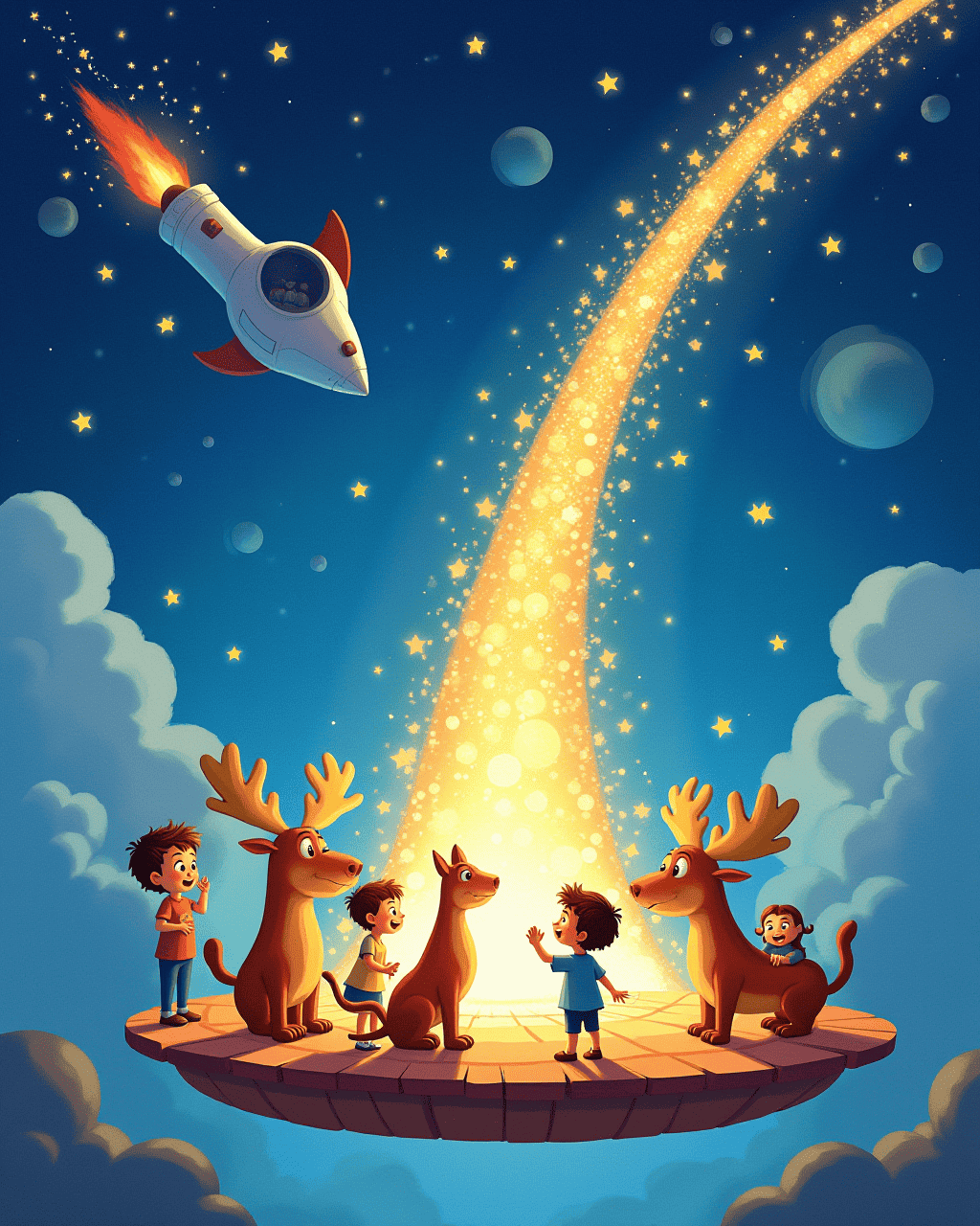 At the end of the journey, all animals gathered on a floating platform. They played music that made the stars dance. The comet cat lit fireworks with stardust bursts. The meteor moose shook its body, creating a meteor shower for applause. Children shouted Space Zoo: Amazing Adventure as the sky glittered.