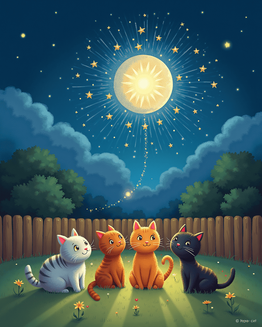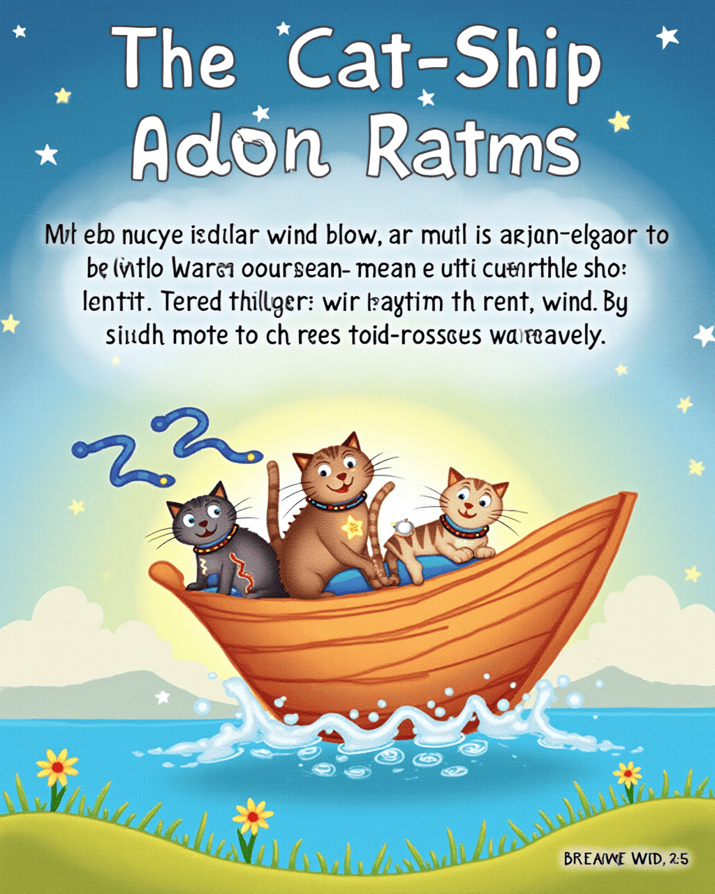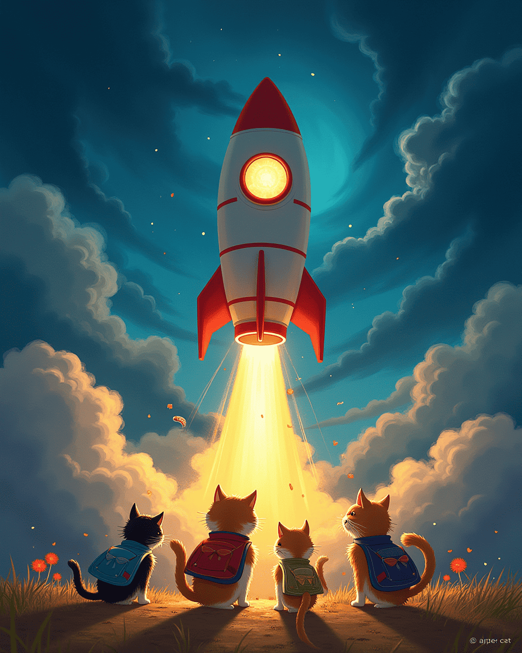 Captain Whiskers and his crew of fluffy cats gather on the launchpad. They check the cat-circuit boards that glow in rainbow colors. The rocket’s engines are replaced by a giant ball of yarn that spins and whirrs. The wind whistles as the countdown begins, 'Three, two, one, purr!' and the ship shoots up into the sky. The children on the ground clap their paws and cheer.
