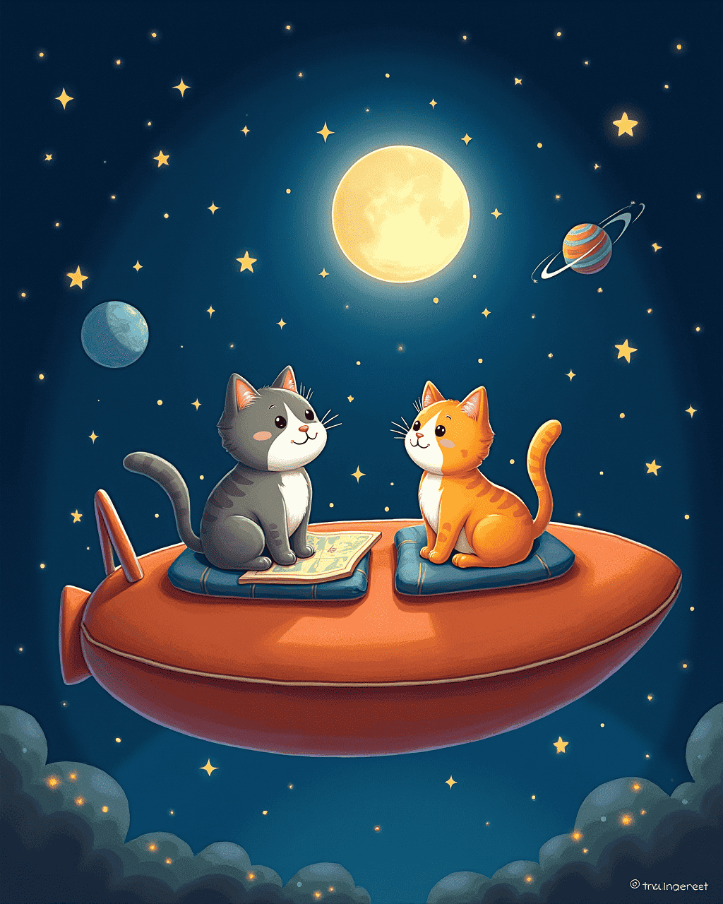 A sudden solar wind blows, and the cat-ship must race against it. Milo lines the yarn engine with bright stripes. The cats use tail-waddles to steer the ship faster. The tail lights blink in rhythm with the wind. By teamwork, the ship stays on course and reaches the next planet.