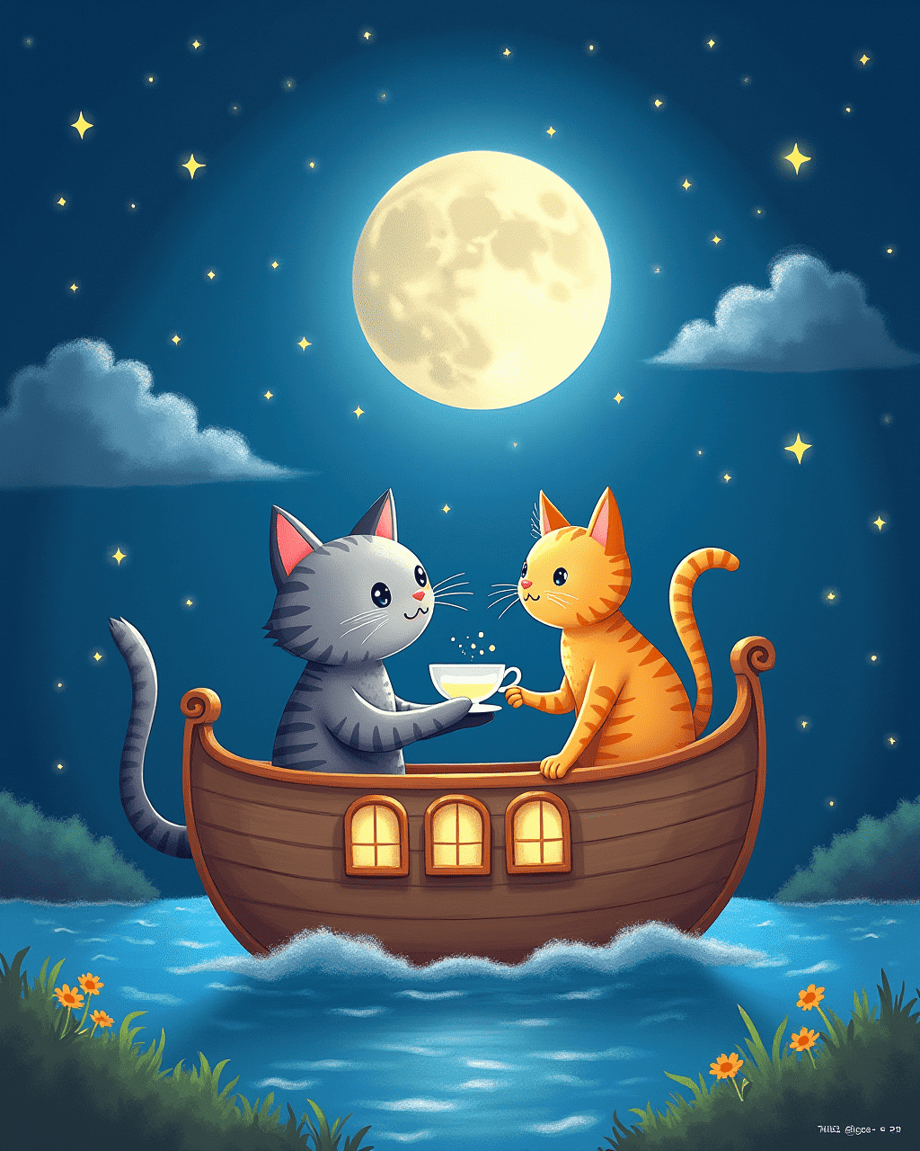 They glide close to the moon, where a moonlit cat named Luna waits. Luna sings a lullaby that glows like moonbeams. The cat-ship's windows show the moon’s smooth silver surface. Captain Whiskers shares a saucer of milk with Luna. The two cats have a play-fight, but quickly become friends.