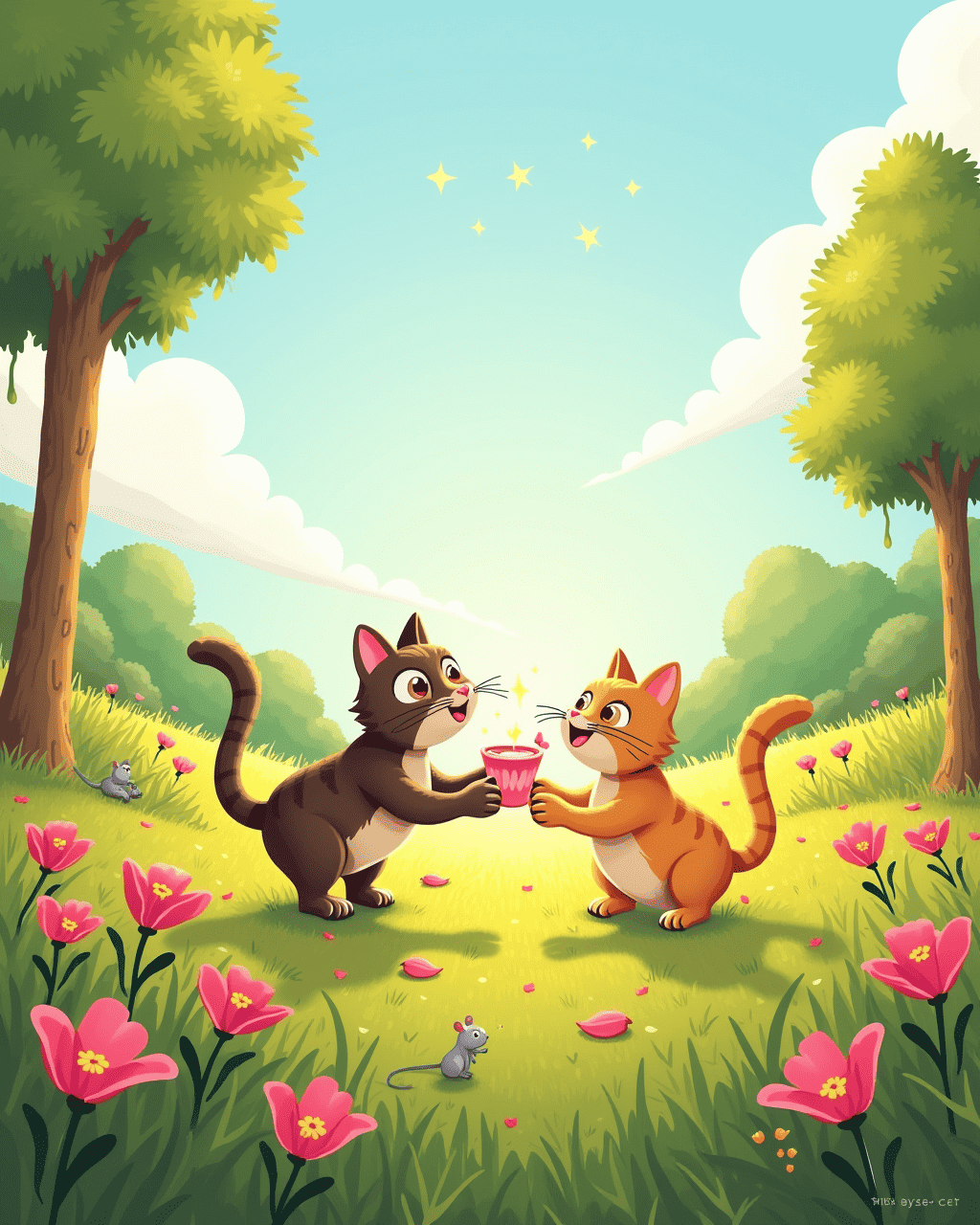 Planet Pepperton is covered in pink pepper flowers. The cats hop onto the ground to taste a flower. They make a tea from the petals and share it with alien mice. The planet’s flowers glow, and a gentle breeze turns the petals into stars. The cats laugh and create a tiny dance on the planet’s field.