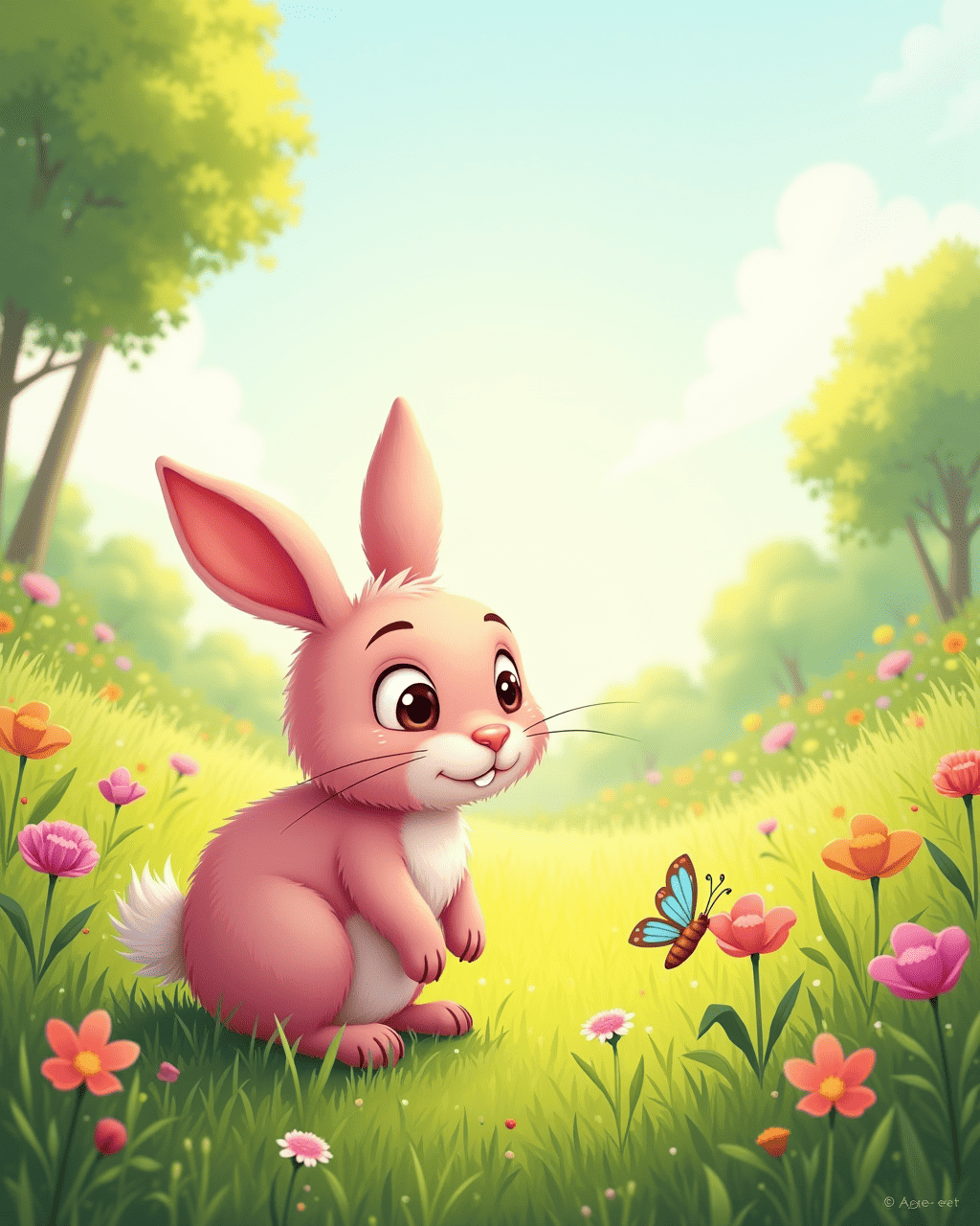 Once upon a time in a colorful meadow, there lived a shy little rabbit named Milo. He loved to hop around, but he was afraid of being different from the other animals. Milo's fur was a soft pink, unlike the usual white or gray of his friends. He would often sit on the grass and listen to the birds sing, wishing he could join in. One day, a bright butterfly named Lila flew by and asked Milo why he looked sad.