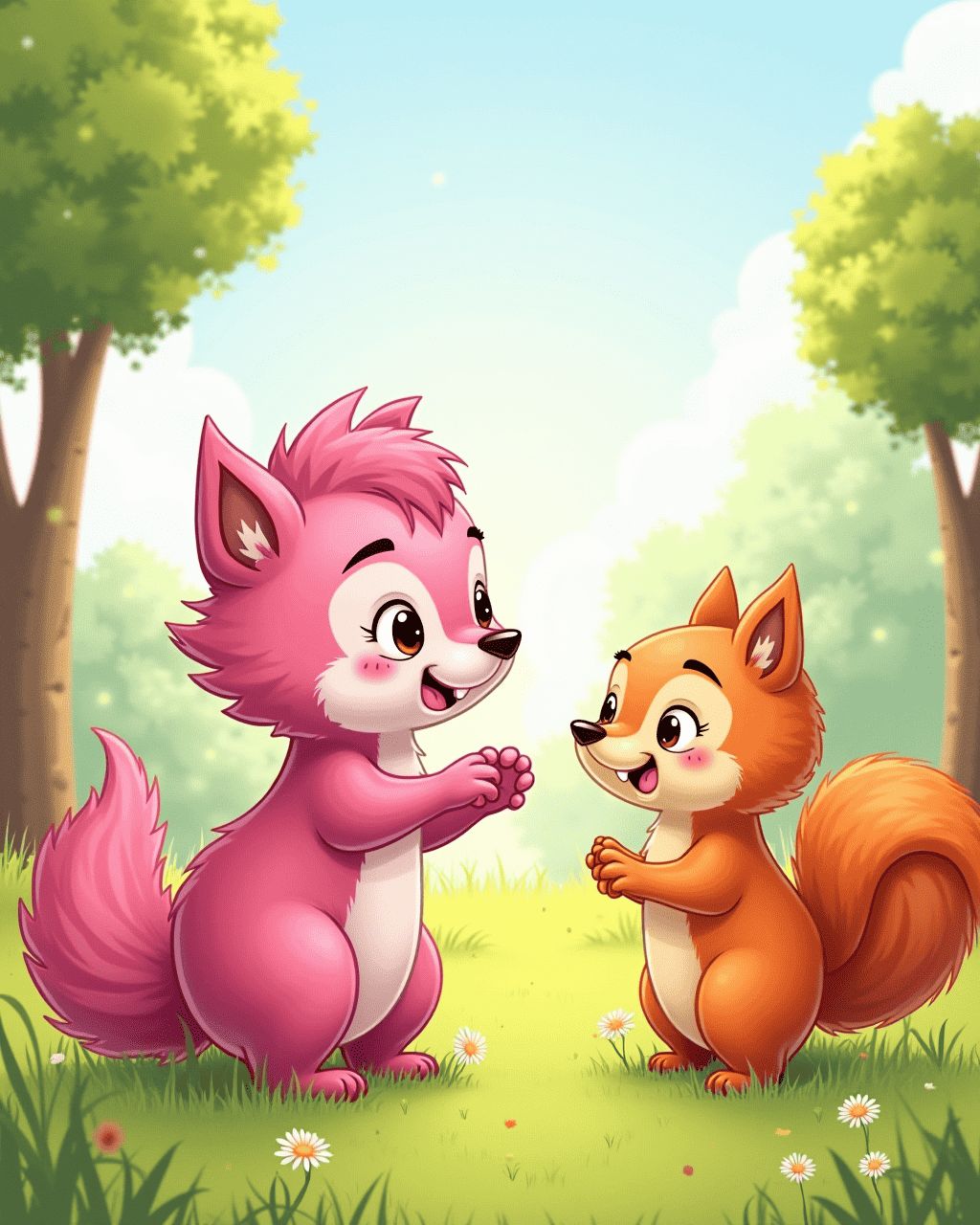 Milo told Lila about his worries and how he thought everyone would reject him if they saw his pink fur. Lila listened gently and reminded him that beauty comes in many colors. She promised to help him find confidence and friendship. Together they visited the friendly squirrel, Sam, who had a bright orange tail. Sam laughed at Milo’s shade and said, "Differences are like bright coins we can use to build a bridge of friendship."