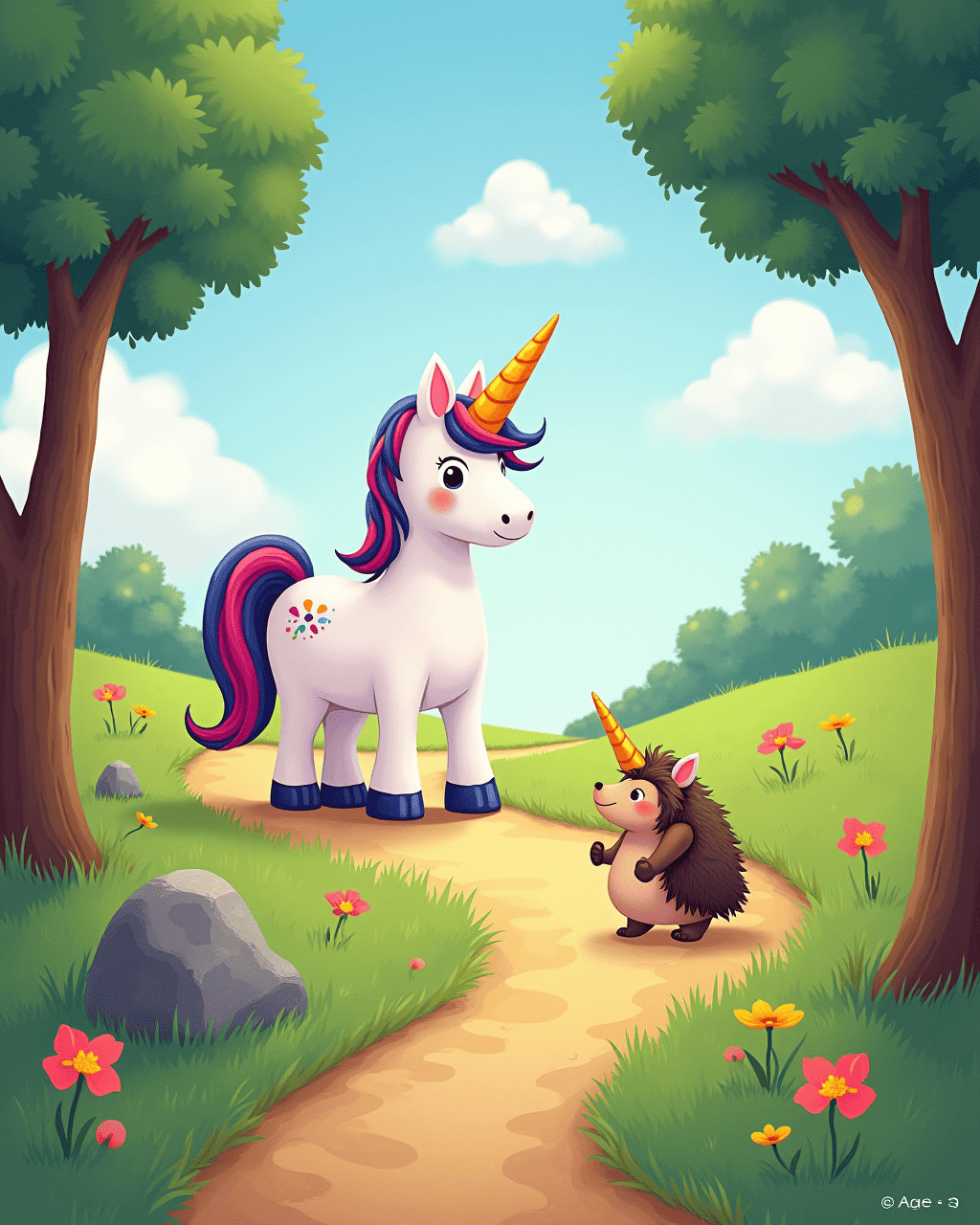 Along a winding path, Luna met Hattie the Hedgehog, whose tiny paws could carry secrets. Hattie told her a legend about a hidden prism of light. She said that to retrieve the colors, she must gather pure kindness, courage, and a brave heart. Luna thanked her, feeling determined.