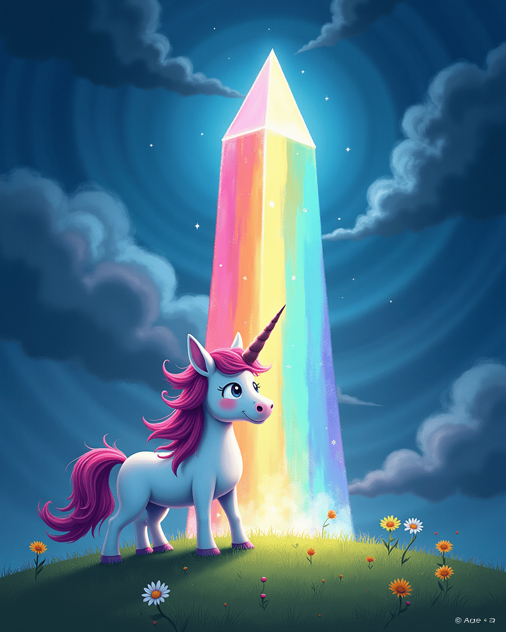 Deep in the valley, a towering crystal prism glittered like a treasure. Hattie and Luna approached it with awe. When Luna stepped close, the prism sang a rainbow song. The colors returned to her mane, shimmering with light, each hue dancing in her mane and tail.