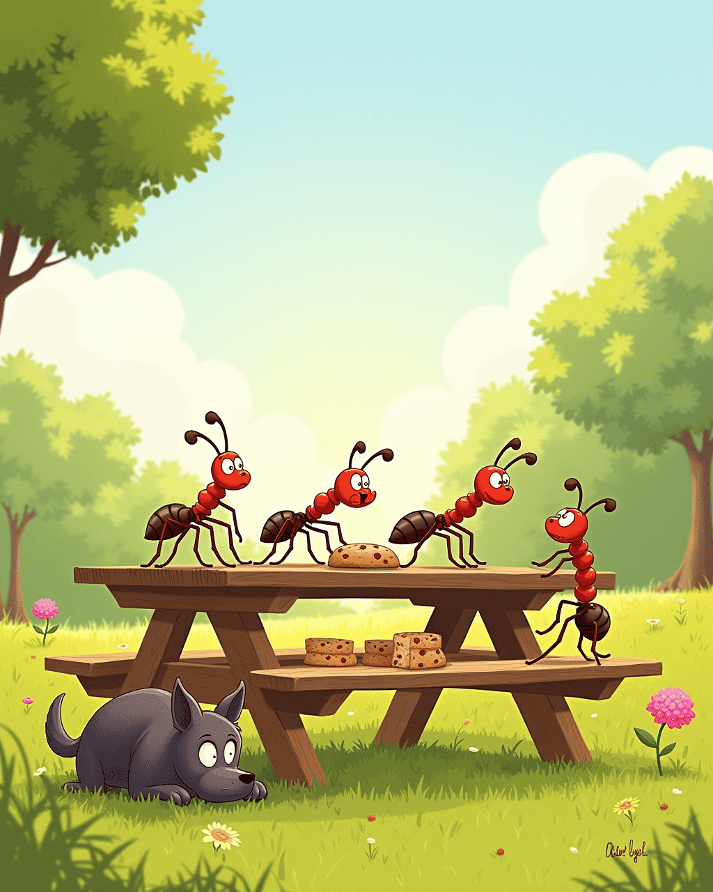 At dawn, the ants marched out like tiny soldiers. They dodged falling water drops from the morning dew and climbed the picnic table leg by leg. The air was filled with the scent of the cookie — chocolate chip! The smallest ant, Pip, led the way, whispering, “Almost there, stay quiet!” The dog snored nearby, unaware of the operation happening inches away.