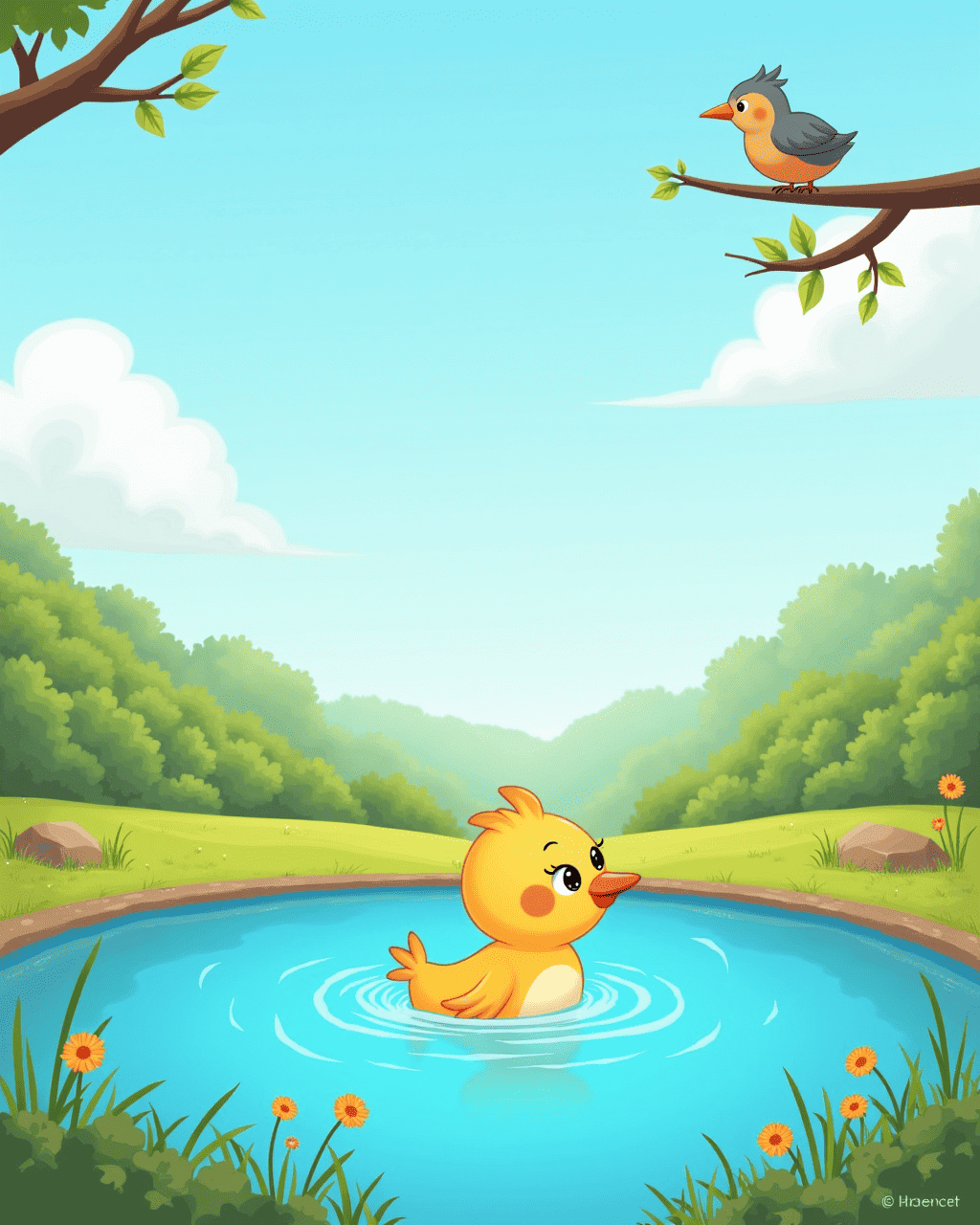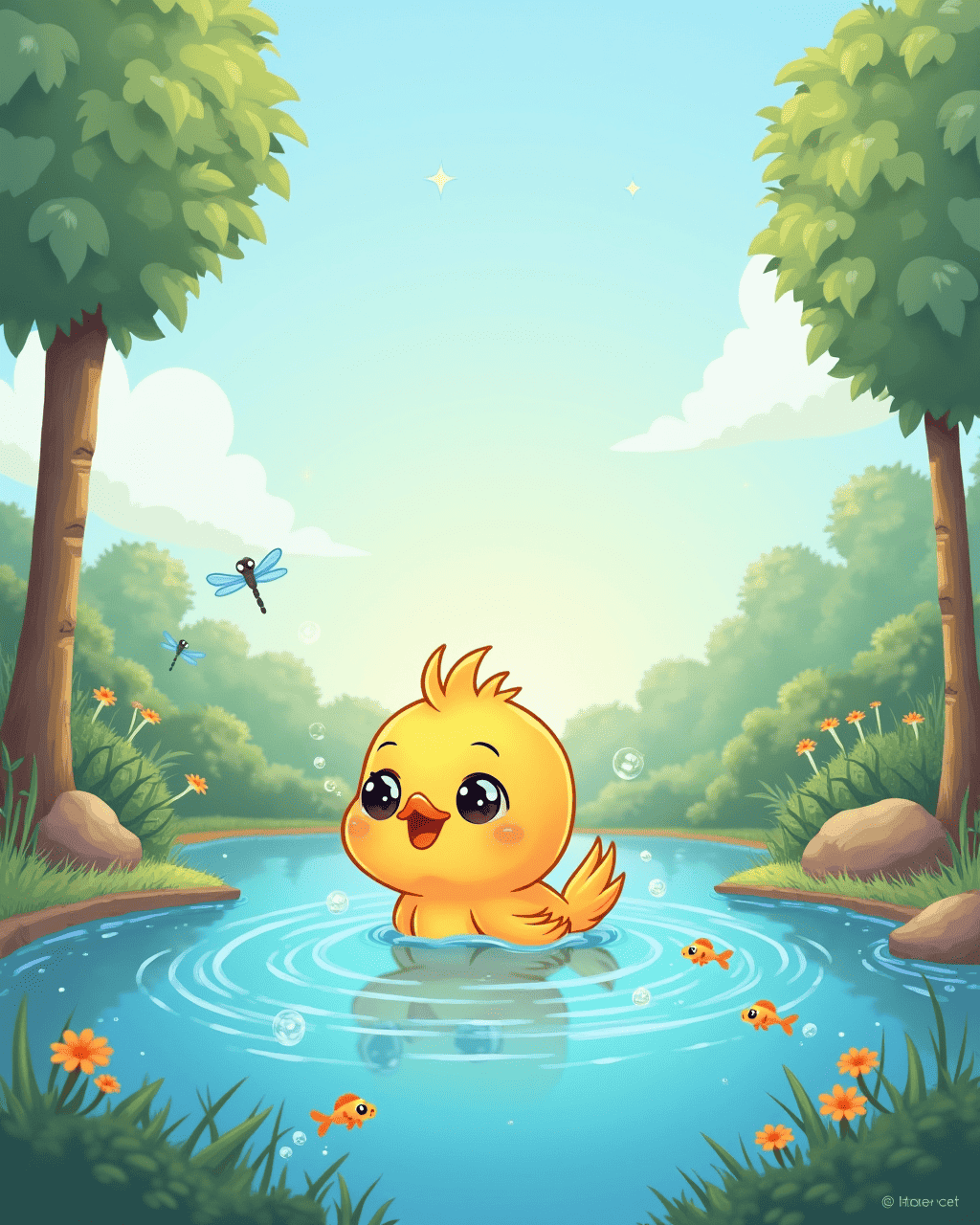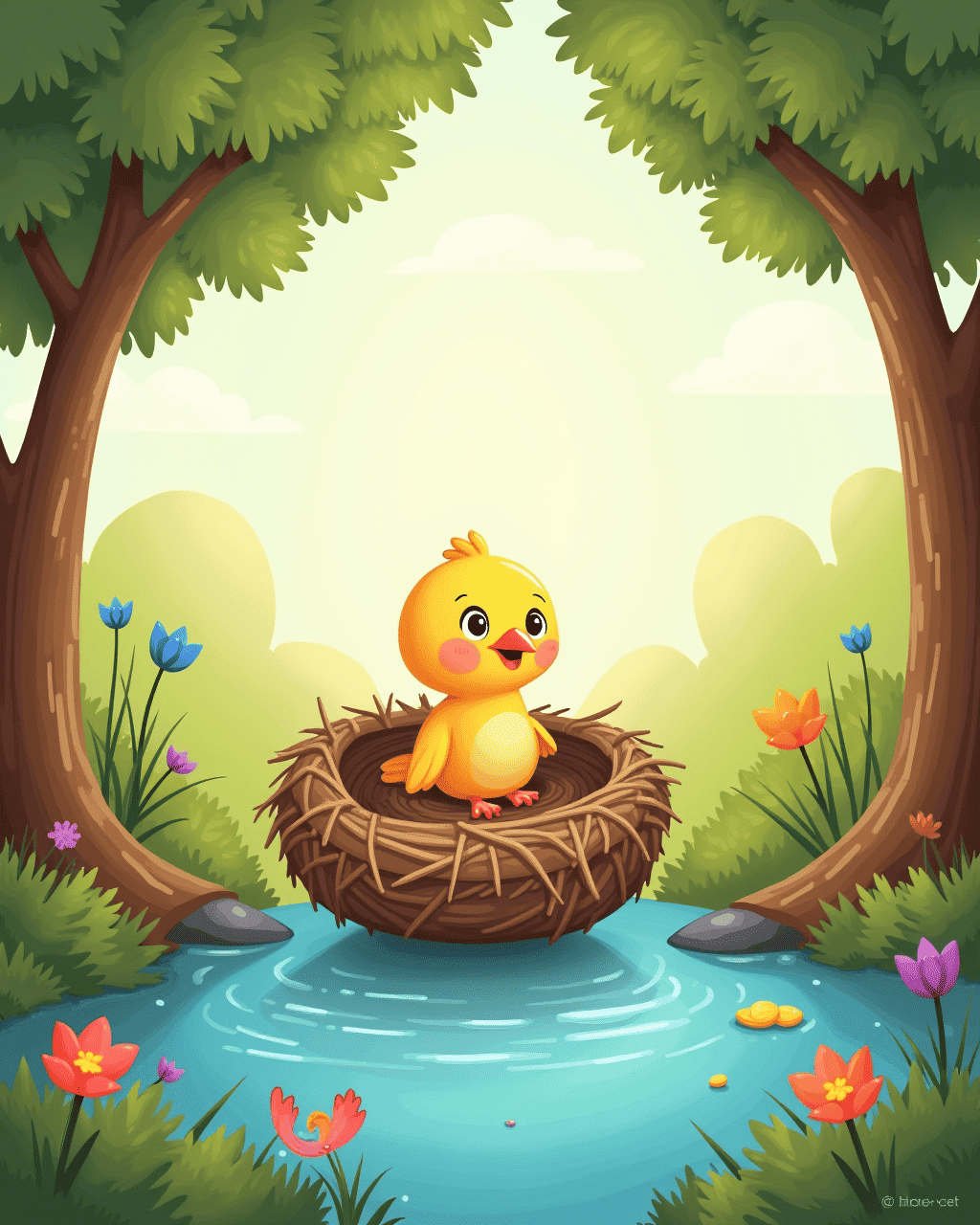 In a cozy nest high up in a tree, a baby bird named Pip chirped excitedly. Every day, Pip watched his brothers and sisters stretch their wings and soar into the sky. Pip tried too, but no matter how hard he flapped, he just couldn’t lift off. One morning, a gust of wind blew him out of the nest—straight into the pond below! Instead of panicking, Pip splashed around and discovered something surprising—he could float!