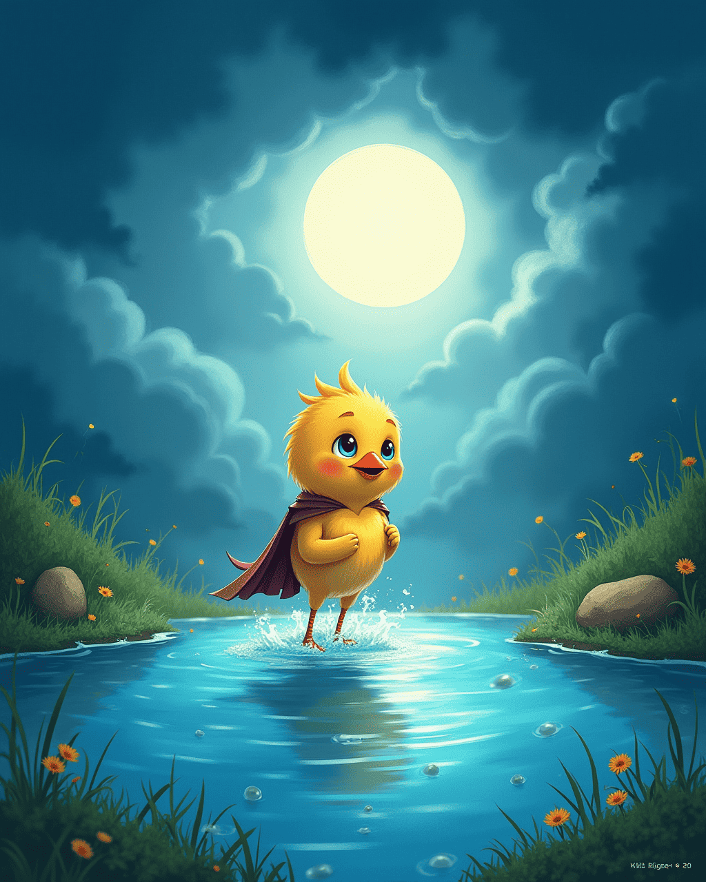 When the storm cleared, the pond animals gathered around Pip. They cheered and called him their hero. Pip looked at his reflection in the water and smiled. He might never fly through the clouds, but he could dance across the waves. From that day on, Pip taught every young bird who fell into the pond that it’s okay to be different—sometimes, being different makes you special.