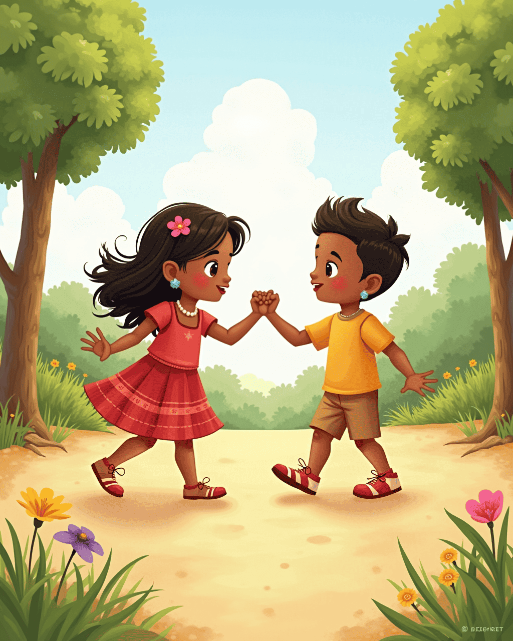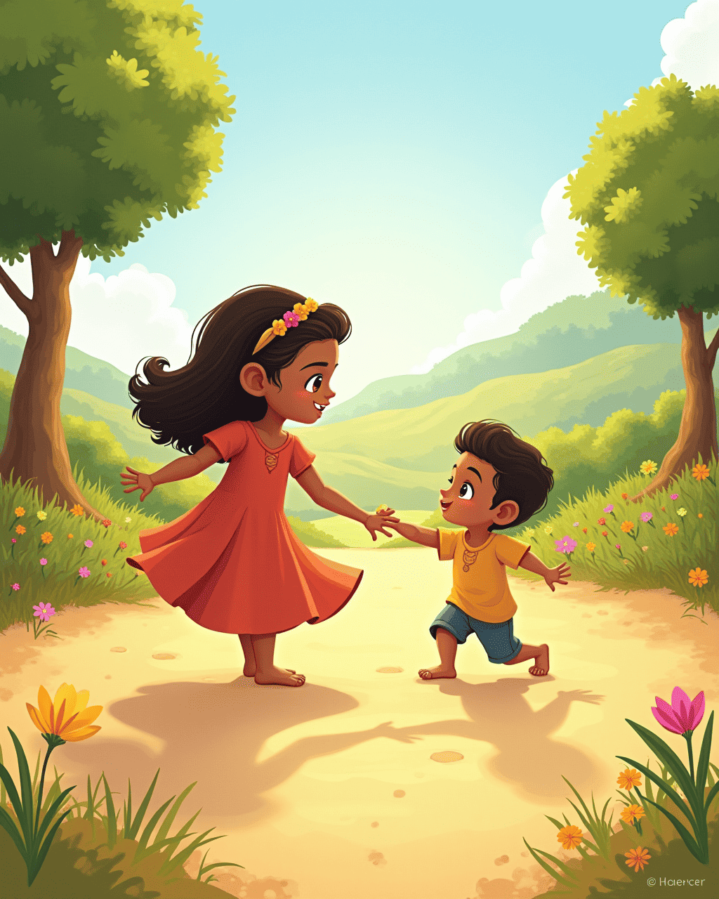 Every morning, the village woke to the sound of rustling feet. No one spoke a word. Instead, they greeted each other with a gentle swirl or a bright hop. Little Lira loved to dance her good mornings, tracing circles in the dust as sunlight touched her toes.