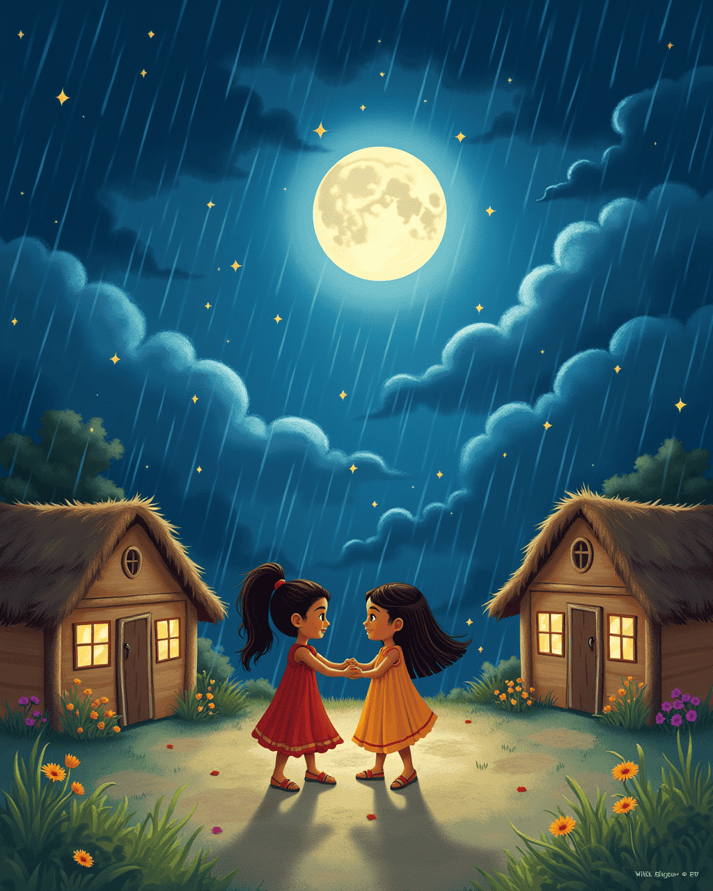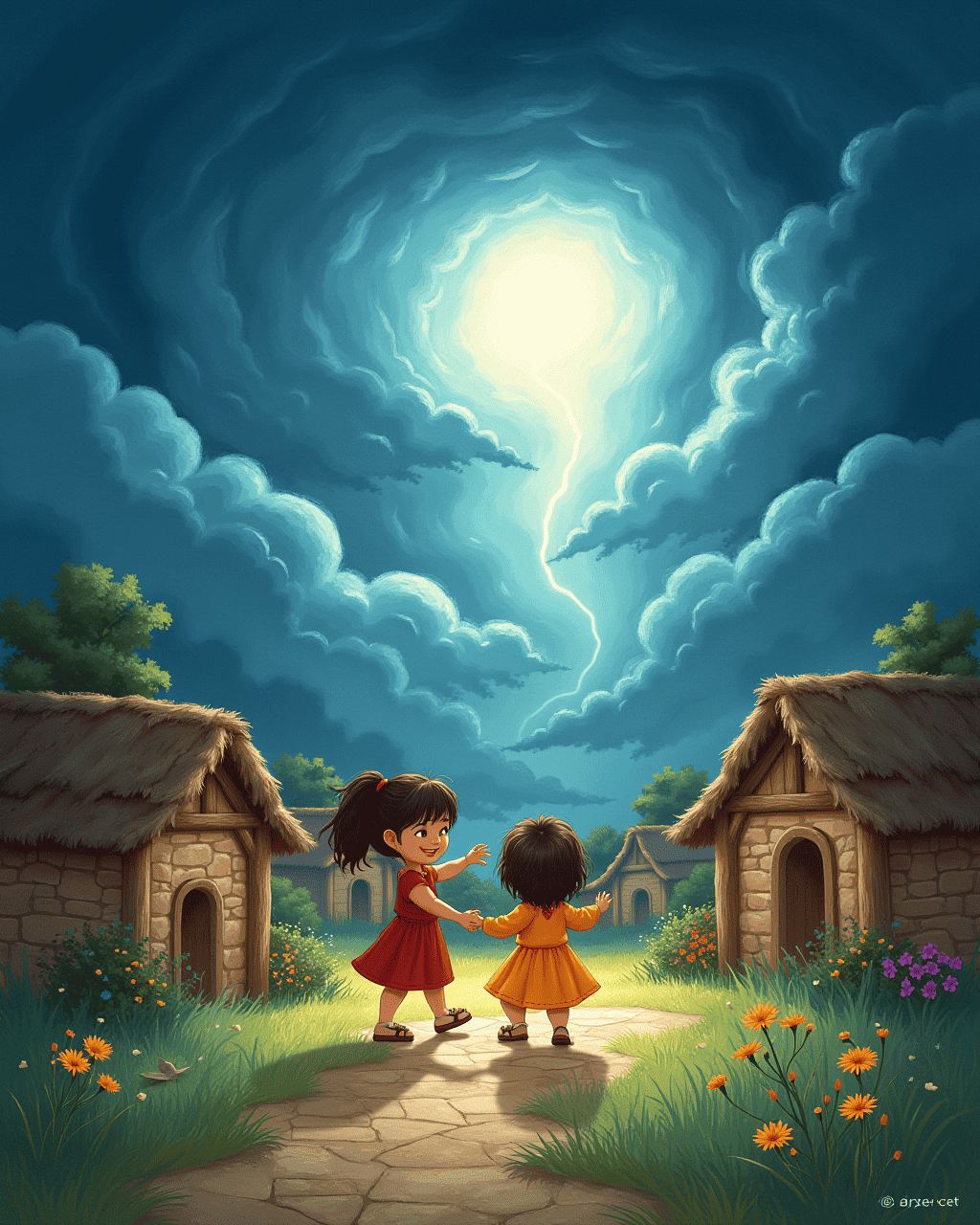 One afternoon, dark clouds rolled in. The villagers gathered in the square, their feet tapping in alarm. Without words, they warned each other of the storm. Lira and Toma joined, stamping and spinning, their bodies shouting louder than thunder.