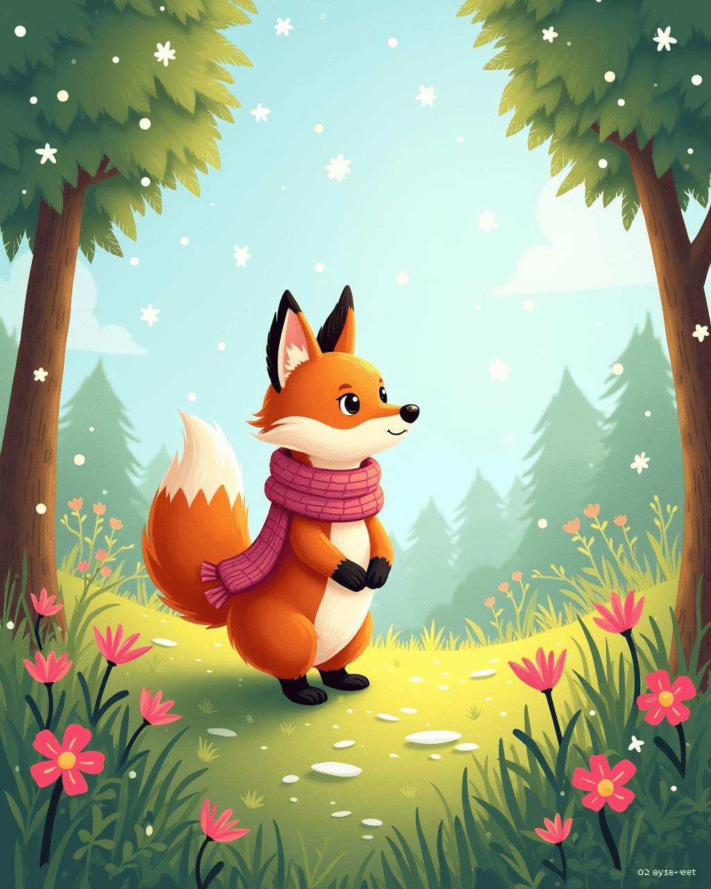 Fifi the fox lived in the cozy burrow near the forest edge. It was a chilly day outside, and snowflakes swirled in the air. Every flake looked unique, like a tiny crystal in the sky. Fifi was excited to see if she could find the biggest and brightest snowflake. She grabbed her warm scarf and set out into the silent forest.