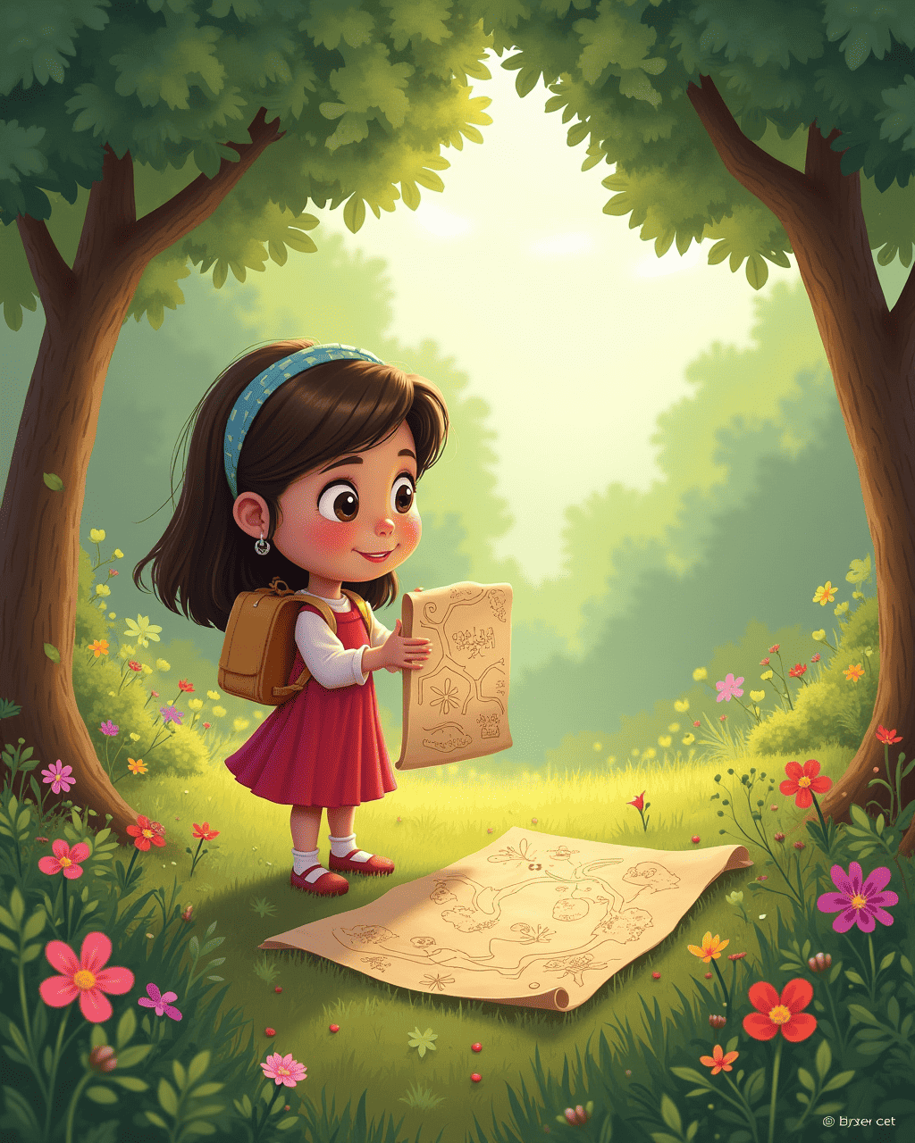While walking deeper, Fifi found a crumpled parchment caught on a pine. The map was drawn with white ink on a rough piece of paper. It showed a path through the forest to a place marked with a star. Fifi believed the glowing snowflake could guide her along this secret trail. She studied the map, feeling a spark of excitement in her chest.