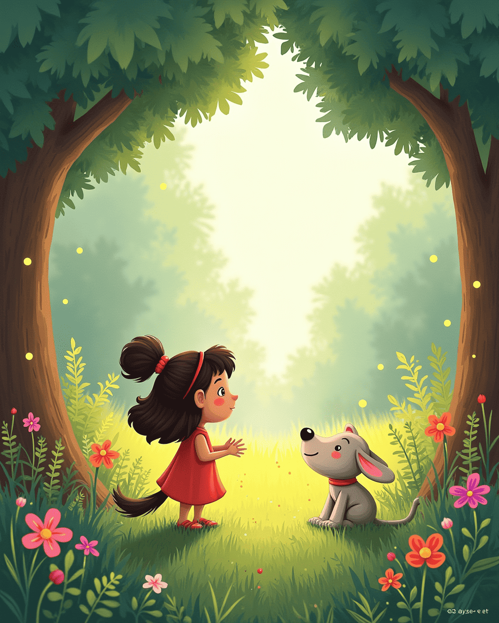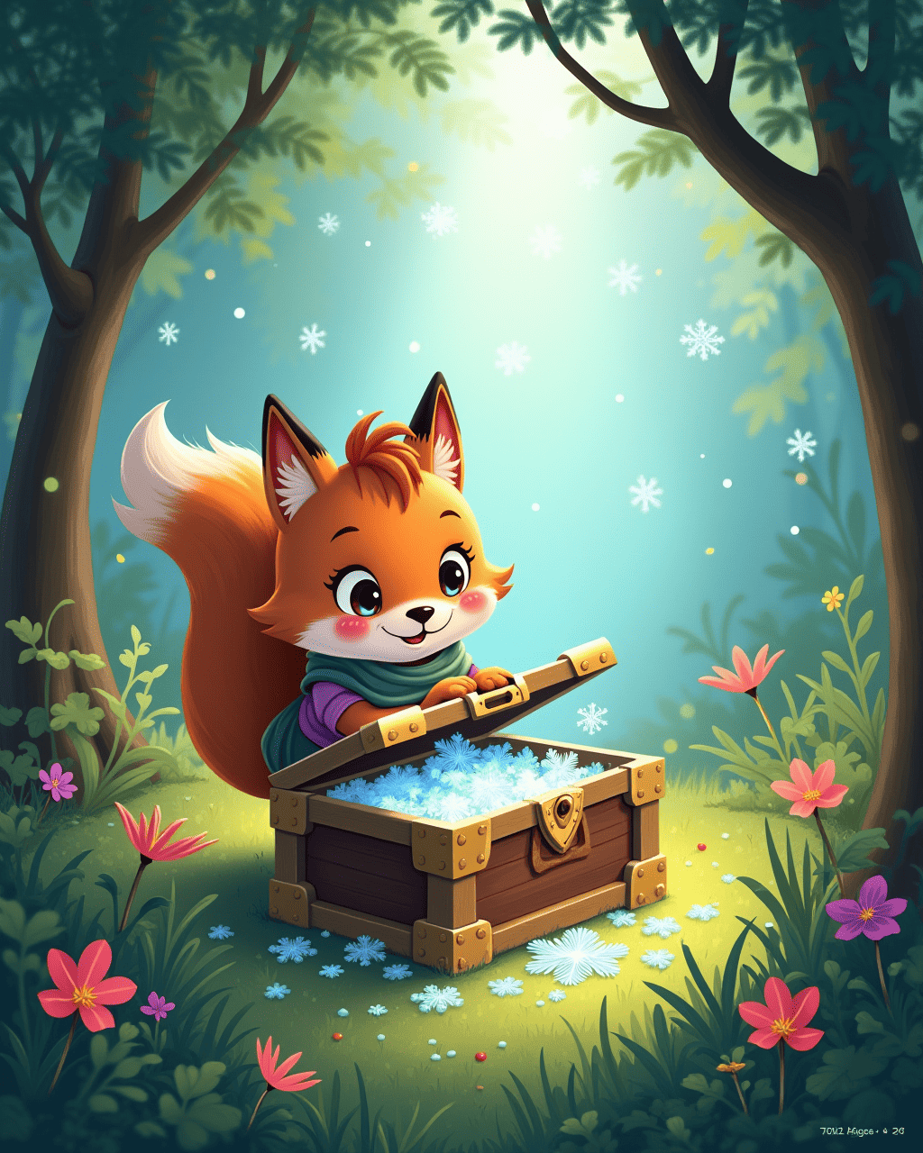 She opened the chest carefully, and inside lay dozens of sparkling snowflakes like tiny stars. Each flake sparkled with the same blue glow as the one she carried. Fifi knew that the treasure wasn’t gold or jewels, but the wonder of winter’s beauty. She let a few flakes drift into the air, brightening the dark forest floor. With a heart full of joy, she decided to share this treasure with all her forest friends.