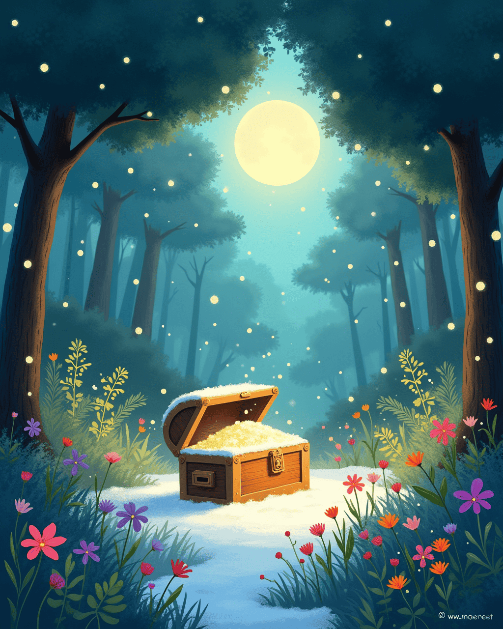 Beyond the hollow, Fifi discovered a hidden glade illuminated by moonlight. A gentle mist drifts around the trees, and the snow glittered everywhere. In the center of the glade, a chest sat beneath a giant pine. It glittered like a beacon for brave explorers. Fifi approached it with cautious steps and curiosity.