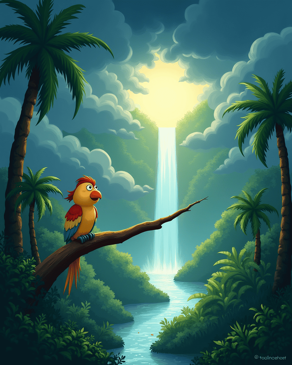 Thanking the parrot, he hurried off toward the sparkling sound of water.