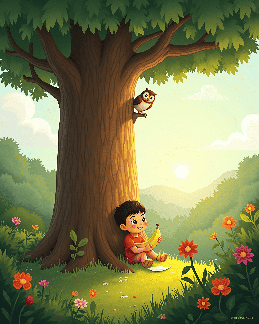 An owl whispered, “The banana grows at the top of this tree, but beware—it’s guarded by the wind.”